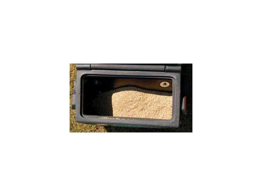 Zásobník osiva - Zásobník s nosností 11,3 kg. Na víku zásobníku najde obsluha instrukce k optimálnímu nastavení množství osiva dle odrůdy trávy. Zásobník je plastový a odolá tak nepříznivým vlivům počasí.