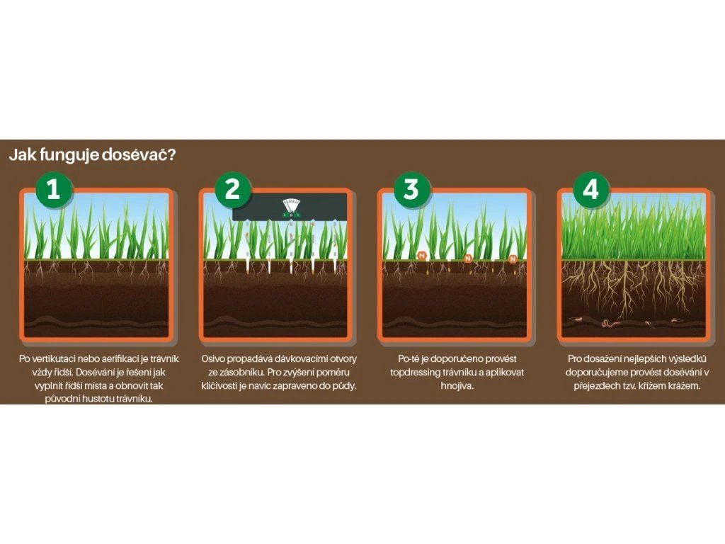 Do objemného boxu se vejde až 11,3 kg osiva. Box je z polykarbonátu, tzn. že nepodléhá korozi a má nízkou hmotnost. Pokyny pro setí různých druhů trav jsou umístěny pod víkem, což pomáhá nastavit správné dávkování osiva. Vysoká kvalita všech konstrukčních prvků, jako jsou kola, rám či ložiska, zajišťuje dlouhou životnost.