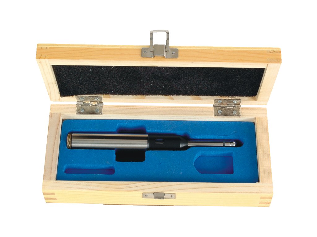 Indikátor slouží k ustavení, popř. vystředění obrobku vůči vřetenu. Kalená, pružně uložená kulička je spojena s velmi citlivým senzorem, který po najetí kuličky na plochu obrobku okamžitě rozsvítí indikační žárovku. Upínací ø 20 mm H7, kulička ø 10 mm, max. nesouosost 0,005 mm.