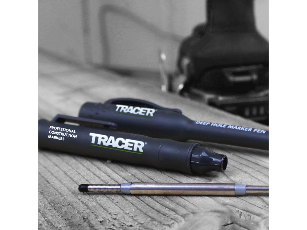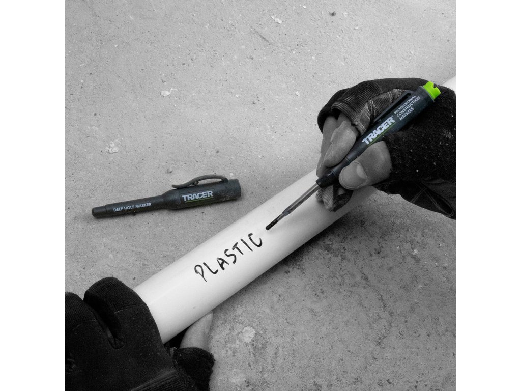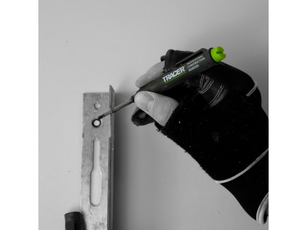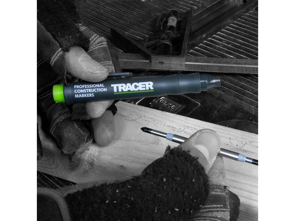 Unikátní design řemeslnického značkovače Tracer má oboustranný hrot, který lze obracet tak, aby vám umožnil značení tenkých i silných čár jediným perem. Víčko s háčkem slouží zároveň jako pouzdro, díky kterému můžete s popisovačem rychle a jednoduše manipulovat. Dokáže psát na většinu suchých povrchů, bez ohledu na to, zda jsou lesklé nebo hrubé.