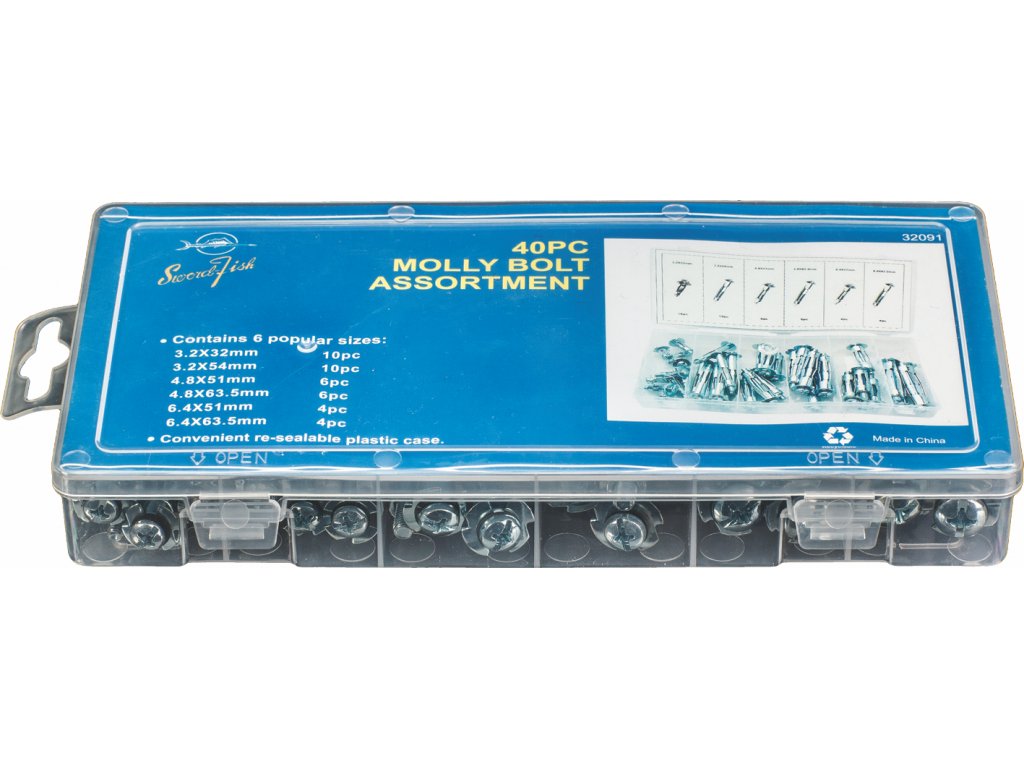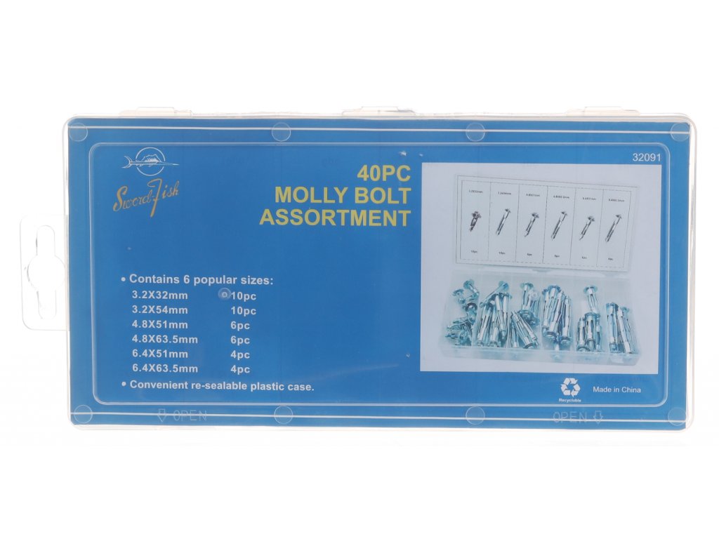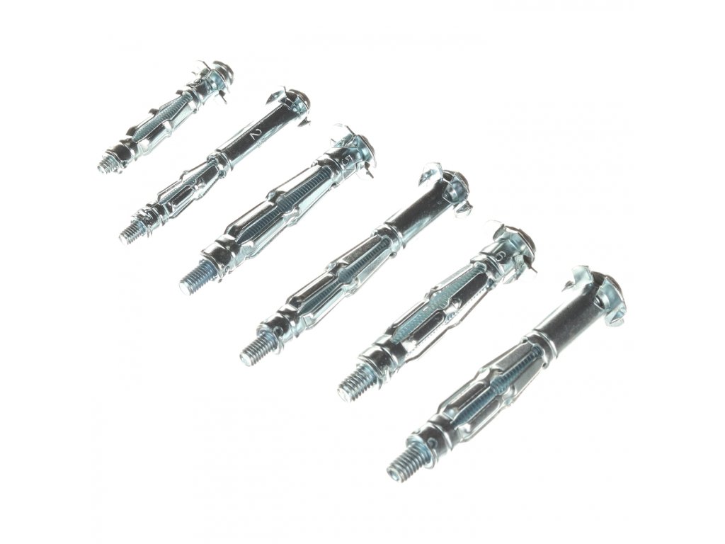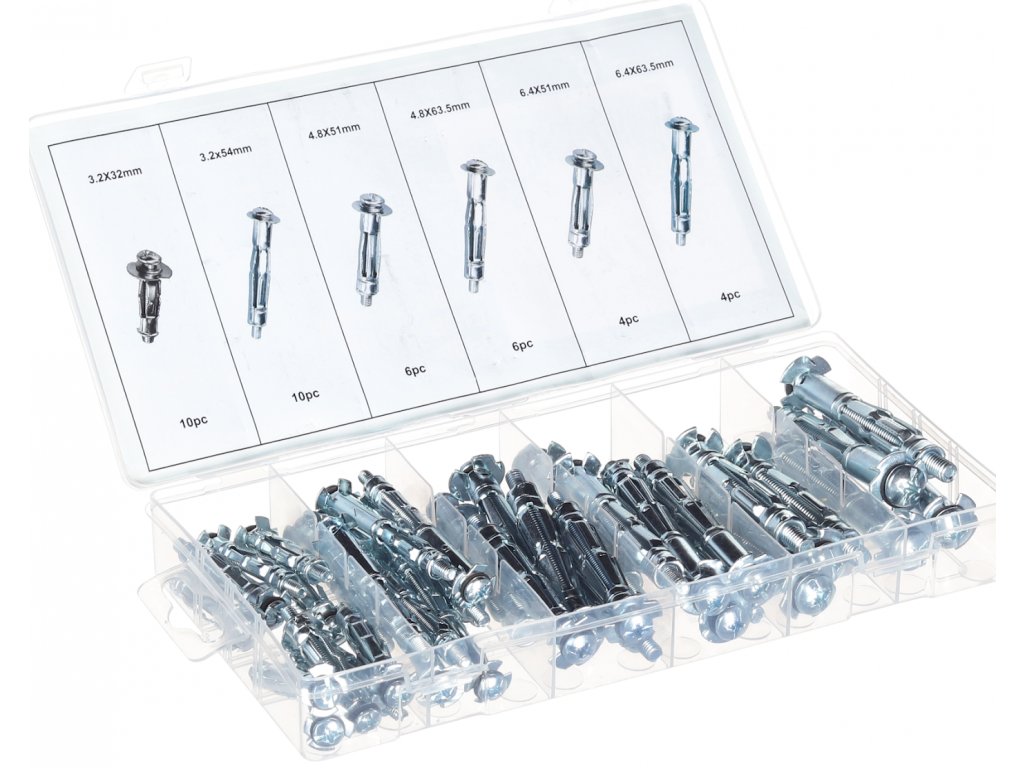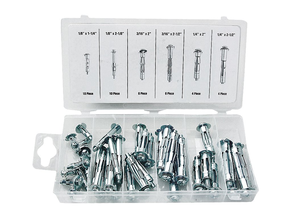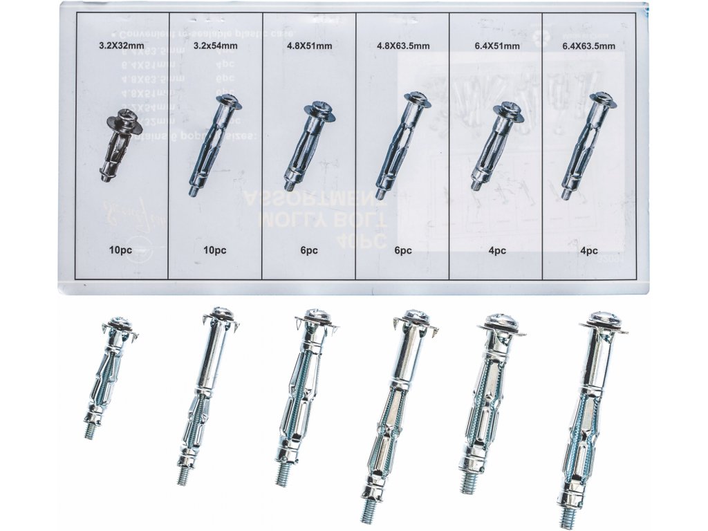 Sada obsahuje hmoždinky 10 ks 1/8“ × 1 – 1/4"; 10 ks 1/8“ × 2 – 1/8“; 6 ks 3/16“ × 2“; 6 ks 3/16“ × 2 – 1/2"; 4 ks 1/4" × 2"; 4 ks 1/4" × 2 – 1/2". Baleno v plastovém organizéru s víkem.