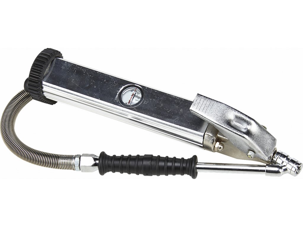 Hustič s hliníkovým tělem a velkým gumovým nárazníkem. 360 mm dlouhá gumová hadice s ochrannou kovovou spirálou, opatřená dvojitou hustící koncovkou. Lineární stupnice tlaku kalibrovaná v barech i PSI. Rozsah 0 – 9,5 bar (0 – 140 psi). Minimální tlak vzduchu 6,9 bar (100 psi), maximální tlak vzduchu 13,8 bar (200 psi). Připojení vzduchu vnitřní závit 1/4".
