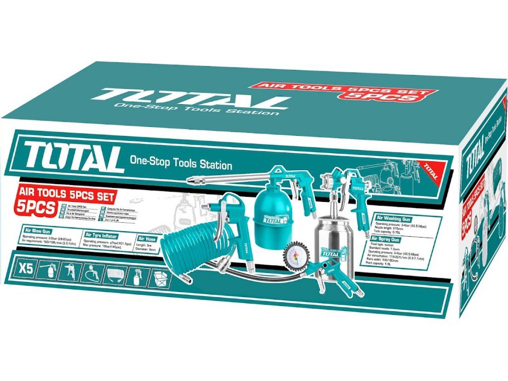 - Délka vzduchové spirálové hadice 5 m, průměr 8 mm, pistole ofukovací, pistole stříkací, plnič pneumatik s manometrem, pistole mycí