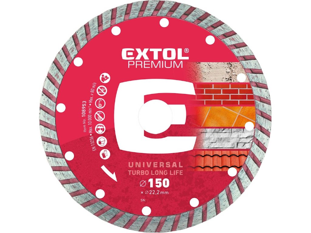 Řada diamantových řezných kotoučů LONG LIFE s prodlouženou životností pro profesionální a poloprofesionální použití. Díky složení diamantové směsi a Výšce segmentu mají kotouče až o 50% větší řezný výkon než ostatní Extol Premium kotouče.