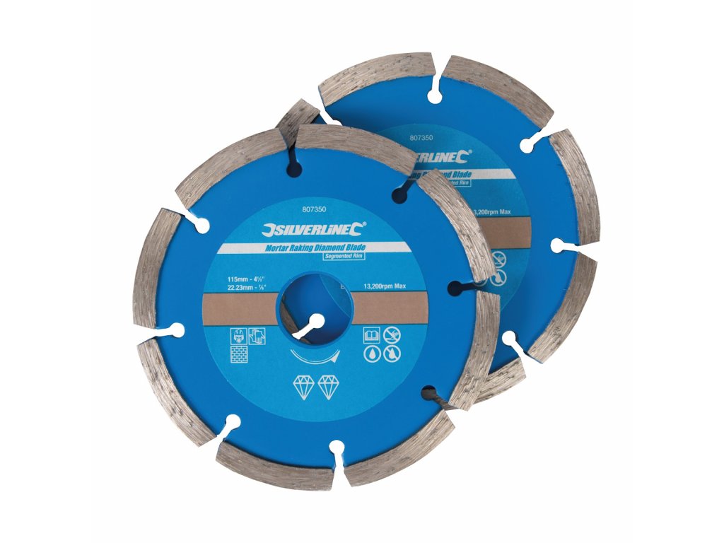 Určený pro odstraňování malty ze spár bez poškození zdiva. Kotouč ze slitiny diamantového prachu, průměrná životnost 200 m2 zdiva, tloušťka 6 mm, max. otáčky 13 200/min., velikost zubů/segmentů 5,0 × 7,30 × 38,00 mm. Kompatibilní s úhlovými bruskami s otvorem 22,23 mm včetně Silverline & GMC.