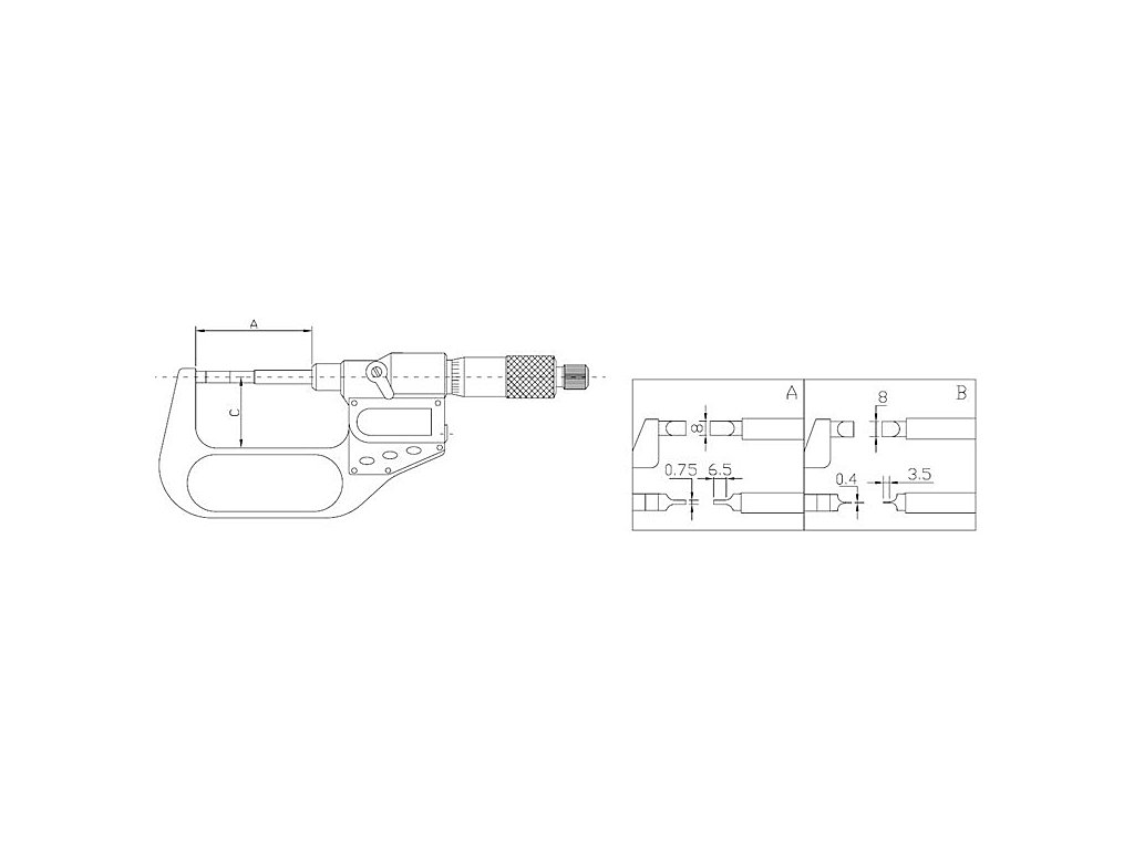 Analogový mikrometr na měření vnějších drážek a jiných těžko přístupných ploch, s řehtačkou a pevným, nerotačním vřetenem a ocelovým lakovaným rámem. Základní příslušenství: Záruční list, návod k použití, kalibrační certifikát, plastové pouzdro.