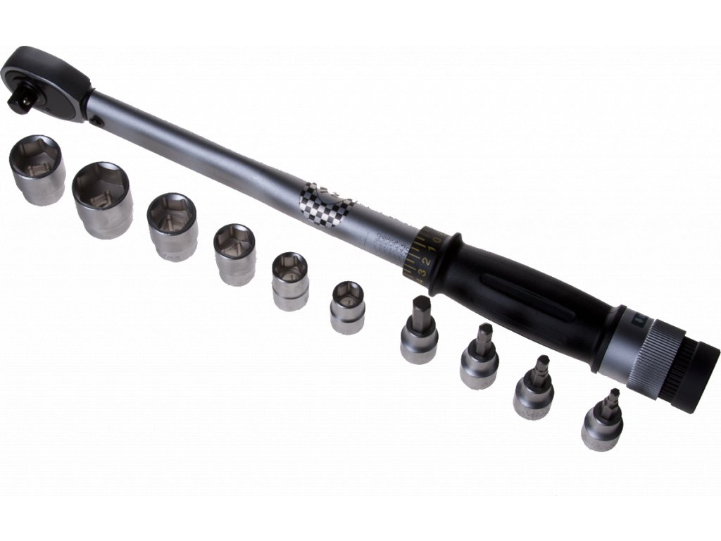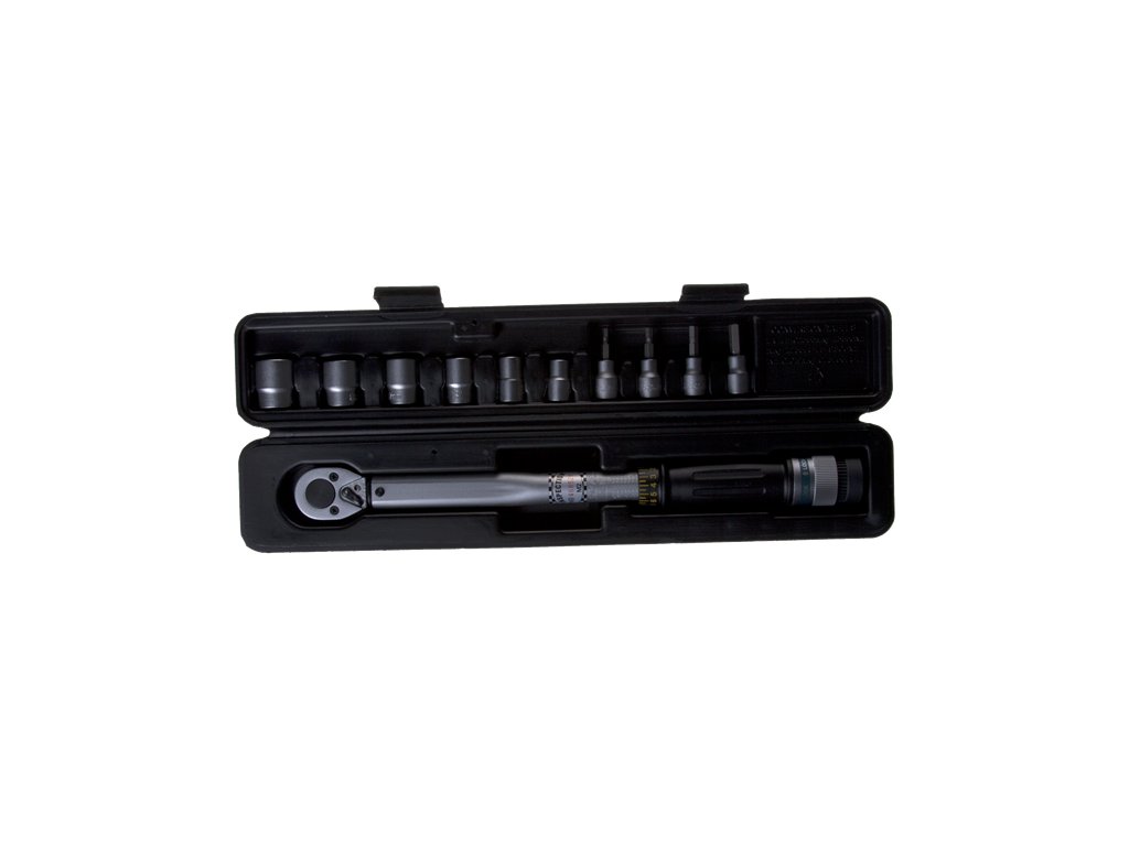 Souprava momentového klíče 19 – 110 Nm, 3/8" a obvyklých velikostí nástrčných klíčů. Plastový kufřík obsahuje šestihranné nástrčné klíče 10, 12, 14, 17, 19, 21 a inbusy 4, 5, 6, 8.
