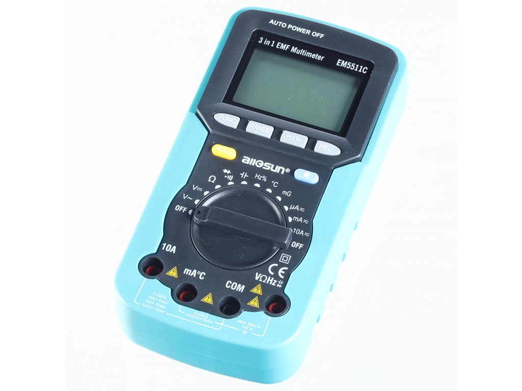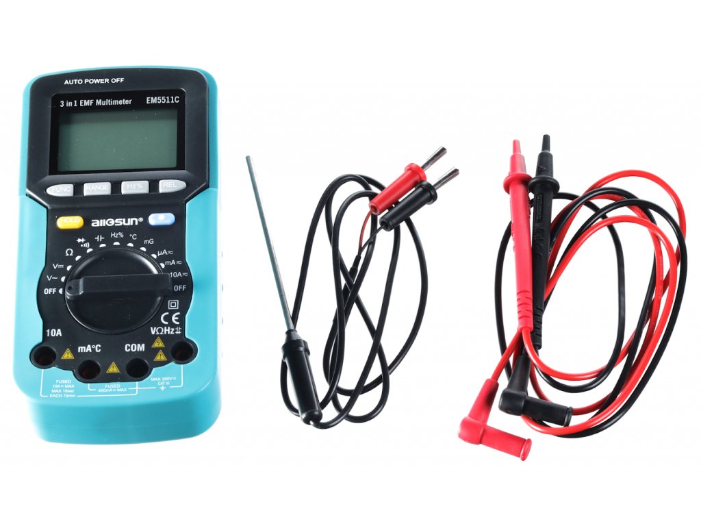 Multifunkční přístroj pro měření stejnosměrného i střídavého napětí, stejnosměrného a střídavého proudu, odporu, kapacity, frekvence, intenzity magnetického pole, kontinuity, měření teploty. Přehledný LCD displej s podsvícením. Automatický a manuální výběr rozsahu, ochrana proti přetížení, zvuková signalizace kontinuity vodiče a funkce podržení hodnoty. Napájení: 1 ks 9 V baterie 6F22, stejnosměrné napětí 400 mV; 4 V; 40 V; 300 V; střídavé napětí 4 V; 40 V; 300 V; stejnosměrný proud 400 µA; 4 000 µA; 40 mA; 400 mA; 4 A; 10 A, střídavý proud 400 µA; 4 000 µA; 40 mA; 400 mA; 4 A; 10 A, odpor 400 Ω; 4 kΩ; 40 kΩ; 400 kΩ; 4 MΩ; 40 MΩ, frekvence 10 Hz – 200 kHz, kapacita 4nF – 100 µF, měření teploty -20 – 1 000 °C, měření intenzity magnetického pole 400 mG; 4 000 mG, test kontinuity, diodový test. Rozsah dodávky: Multimetr, teplotní sonda, 2 měřící kabely s hroty.