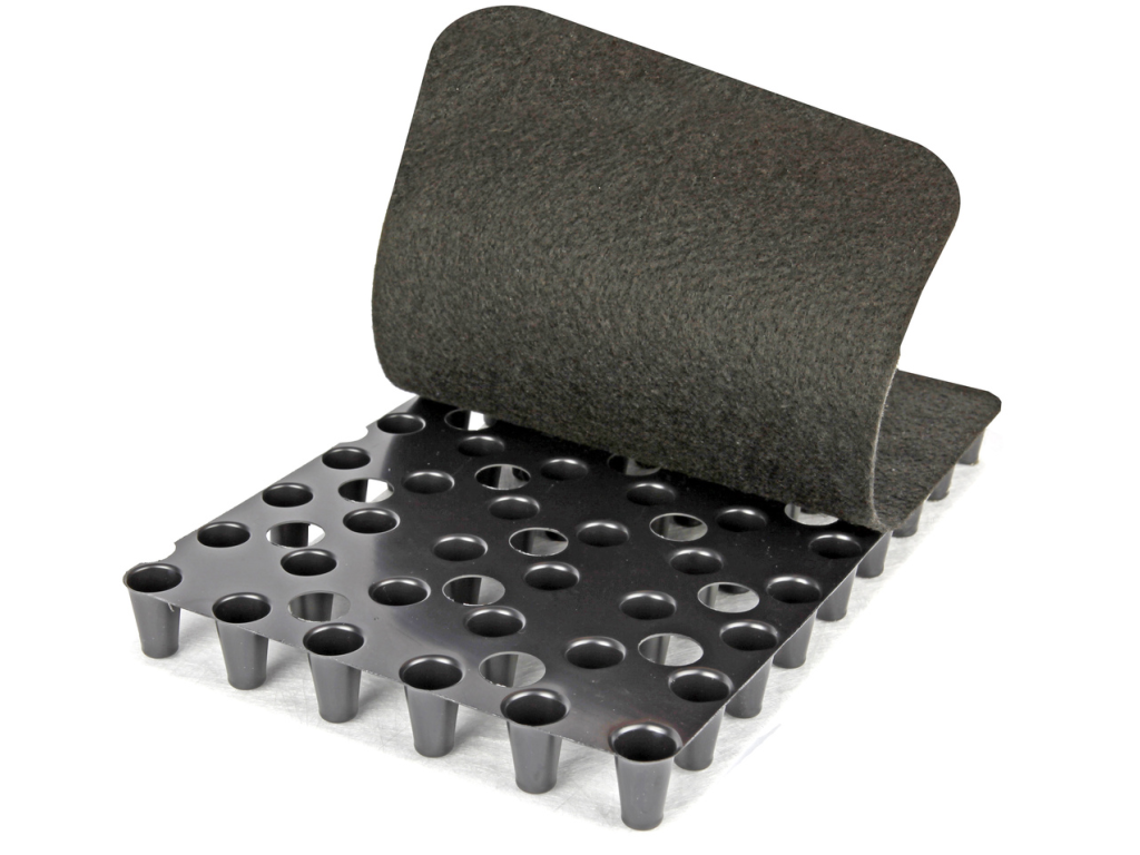 Černá netkaná filtrační geotextilie je přilepena k povrchu hladké strany perforovaného jádra a bílá netkaná geotextilie, plnící funkci paropropustnou, ochrannou a separační, je spojena s každým nopem na odvrácené straně fólie.