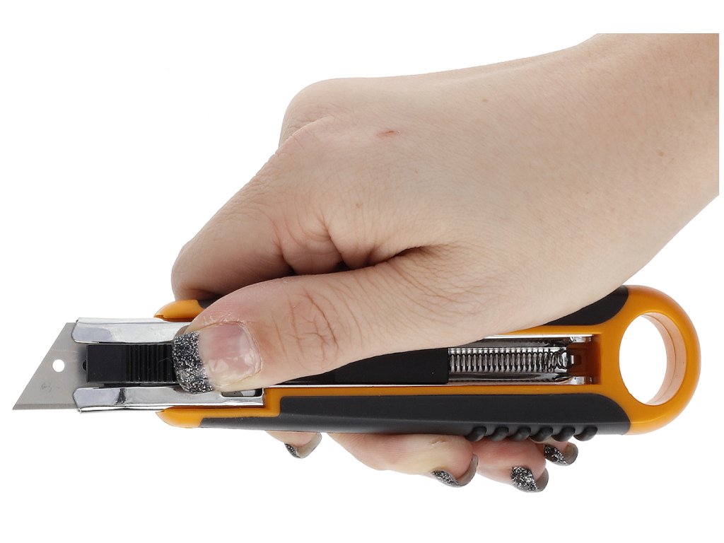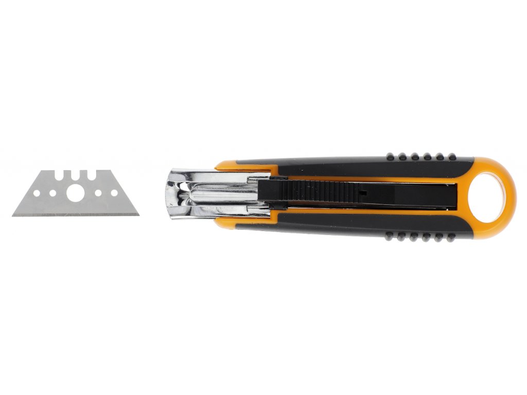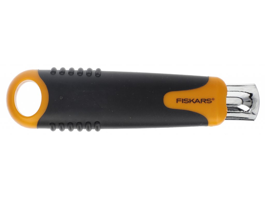 Profesionální odlamovací nůž s praktickým zasouváním břitů. Po dokončení řezu a puštění jezdce se čepel automaticky zasune do těla nože – snižuje se tak riziko poranění. Má pohodlný ergonomický gumový povrch rukojeti pro jisté držení, praktické očko pro zavěšení a speciální oboustranný břit ve tvaru lichoběžníku. Je možné též dokoupit náhradní břity - Fiskars číslo 1004616. Šířka břitu: 18 mm. Záruka: 5 let.