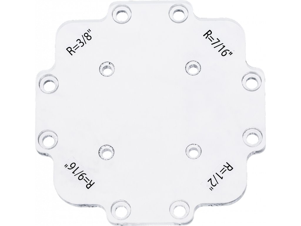 Sada 3 ks průhledných šablon pro rychlé a přesné zaoblování rohů pomocí vrchní frézky. Poloměry oblouků jsou v rozsahu 1/8" až 1", odstupňovaných po 1/8". Sada obsahuje 4 ks vodících opěrných čepů, které se vkládají do připravených otvorů v šablonách.