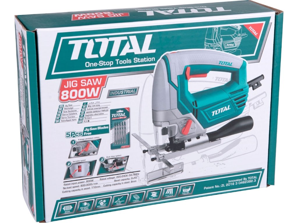 Přímočará pila je určena k provádění dělících a tvarových řezů zejména do dřeva a dřevotřísky, dále také do kovu, umělých hmot, gumy a keramiky s použitím k tomu určených pilových plátků. Pila je vybaven regulací otáček motoru a regulací síly předkmitu pomocí, kterých si můžete upravit chod pily při řezání v různých materiálech. Pila má 800 W a až 3000 otáček/min. Standardně při řezání pila odfukuje piliny z místa řezání, ale pokud k ní připojíte vysavač, můžete tento odfuk vypnout a piliny jen odsávat do vysavače, čímž dosáhnete mnohem čistějšího pracovního místa. Pila má pevnou kovovou základnu pro přesné vedení řezu a rovněž příjemnou pogumovanou protiskluzovou rukojeť. Je dodávána se 3 ks pilových plátků na dřevo.