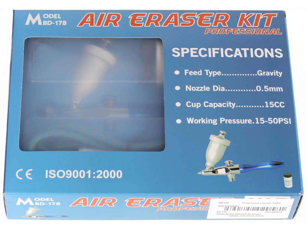 Miniaturní všestranná pískovací pistole je zvlášť vhodná pro opravy vadného laku, odstraňování drobné koroze, čištění součástek, pískování ornamentů v různých materiálech včetně skla a rytí monogramů. Používá se např. v litografii při zvýraznění polotónů, nebo v modelářství. Kapacita nádobky 15 cm³, pracovní tlak 2 – 4,5 bar, délka hadice 2 m, tryska ø 0,5 mm. Sada obsahuje: pískovací pistoli, hadici, držák pistole, kazetu s abrazivem a respirátor.