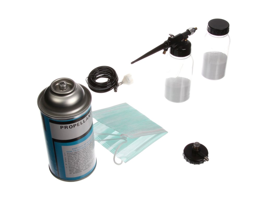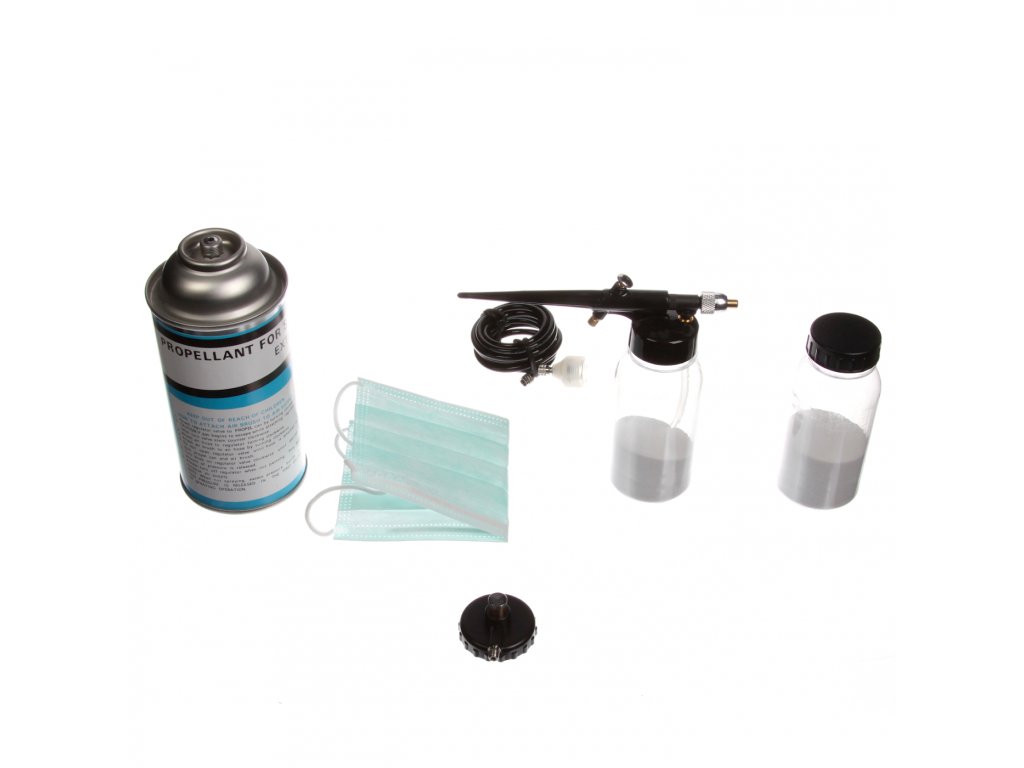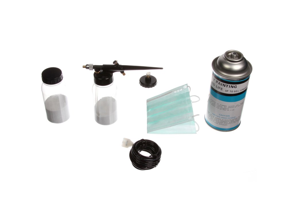 Sada obsahuje malou pískovací pistoli s nádobkou, hadicí s 1/4" připojením ke zdroji stlačeného vzduchu 1,4 – 3,4 atm, nádobu s pohonným plynem, adapter 1/4" a nádobku s abrazivním materiálem 200 g. Je vhodná pro drobnější odstraňování rzi, čištění různých materiálů, dekorativní účely, renovaci modelů a hraček a odstraňování nátěrů z kovu i dřeva. Baleno v papírové krabici.