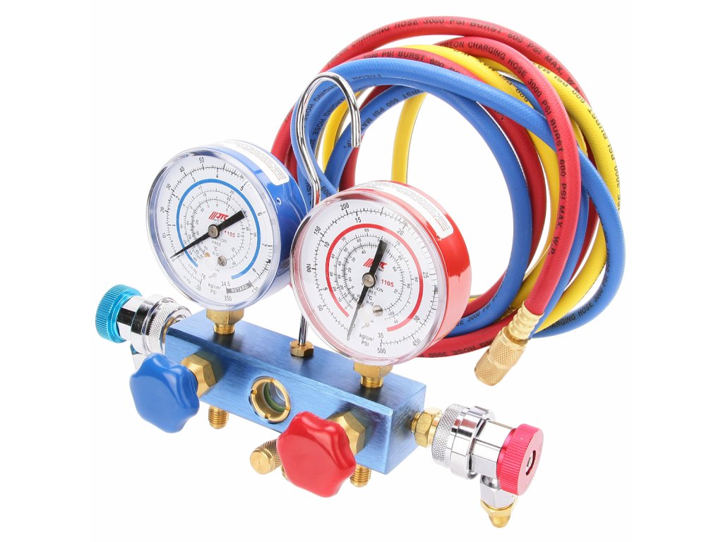 Zařízení slouží k plnění (popř. výměně chladícího media) systému R-134a. K připojení ke klimatizaci slouží 1 500 mm dlouhé hadice ve třech barvách pro lepší orientaci. Manometr vysokého tlaku má stupnici 0 – 35 bar, malého tlaku -1 – 20 bar (vakuum 0 – 1 bar).