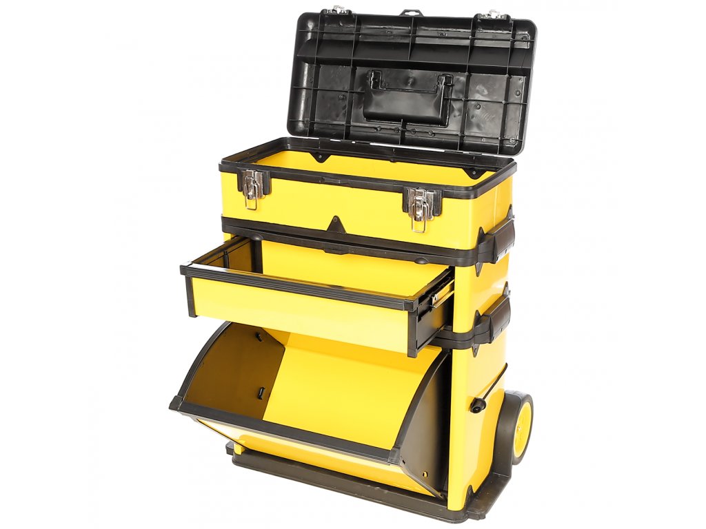 Praktický, pojízdný box na nářadí se třemi samostatnými částmi. Horní kufřík a zásuvku lze odepnout a použít odděleně. Box je vyroben z materiálu PP. Výsuvné madlo až do výšky 850 mm. Ø koleček 150 mm. Celkové rozměry 580 × 360 × 670 mm.
