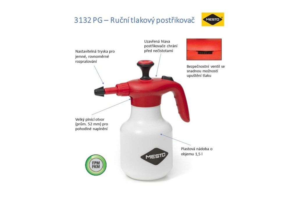 Ruční tlakový postřikovač od německého výrobce MESTO je ideální pro profi použití. Vysoký komfort – bezpečnostní ventil pro uvolnění tlaku a nastavitelná tryska pro jemné rovnoměrné rozprašování.