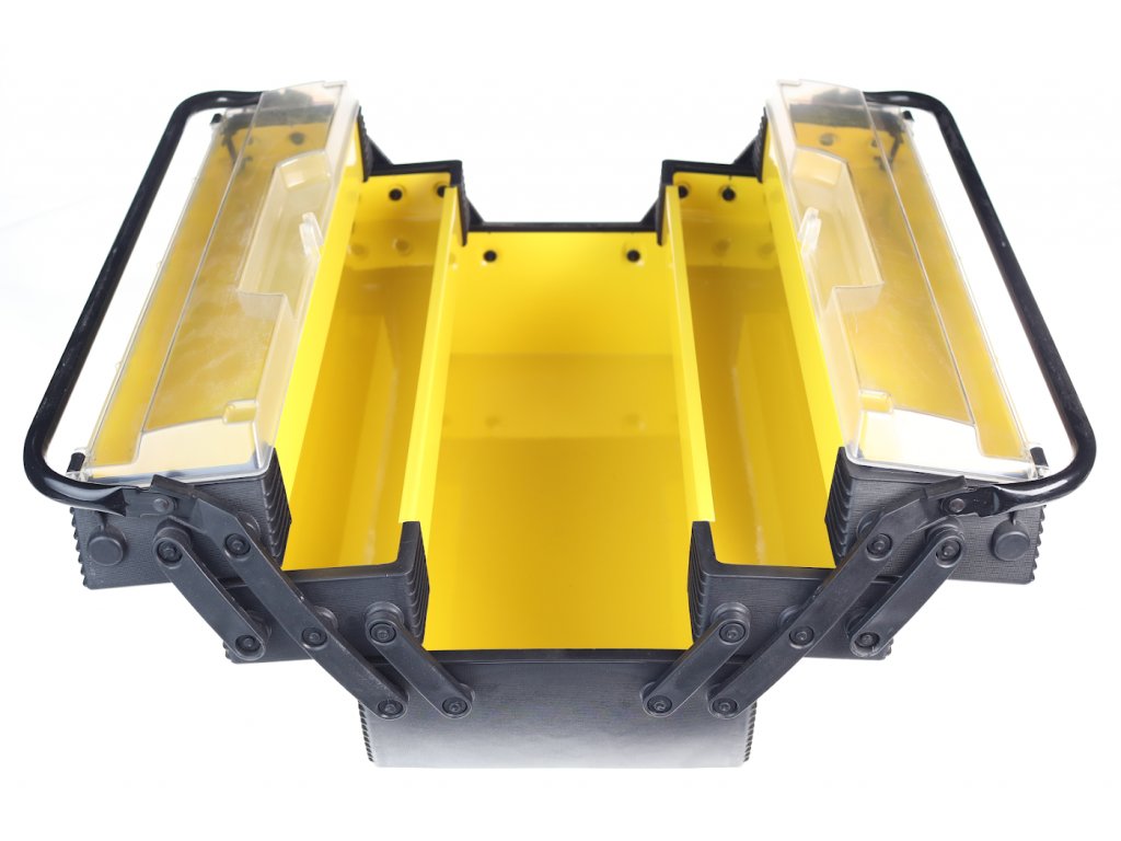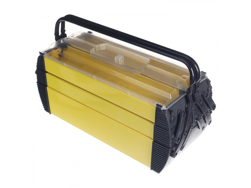 Rozložitelný box na nářadí obsahuje 2 × 2 police, hluboké úložné dno a dělené držadlo pro pohodlné přenášení. Materiál plast a kov, rozměry 520 × 210 × 230 mm. Dodáváno bez nářadí.