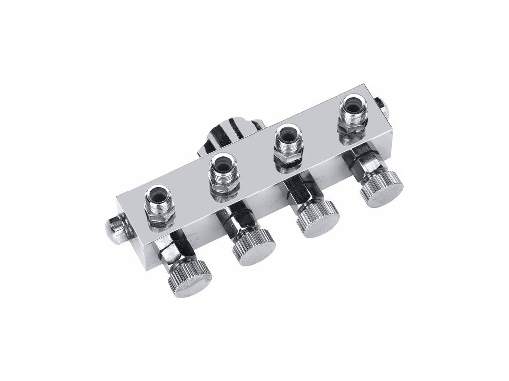 Čtyřcestný rozvaděč stlačeného vzduchu je vybaven čtyřmi samostatnými ventily pro ovládání přívodu vzduchu pro pistole airbrush.