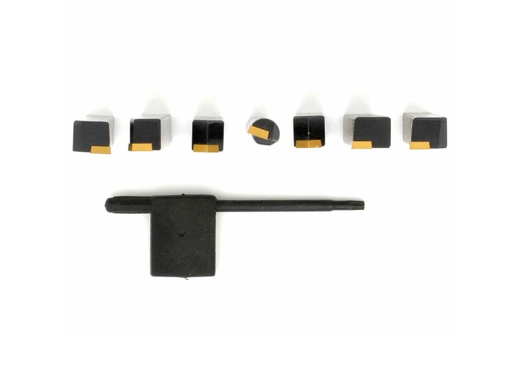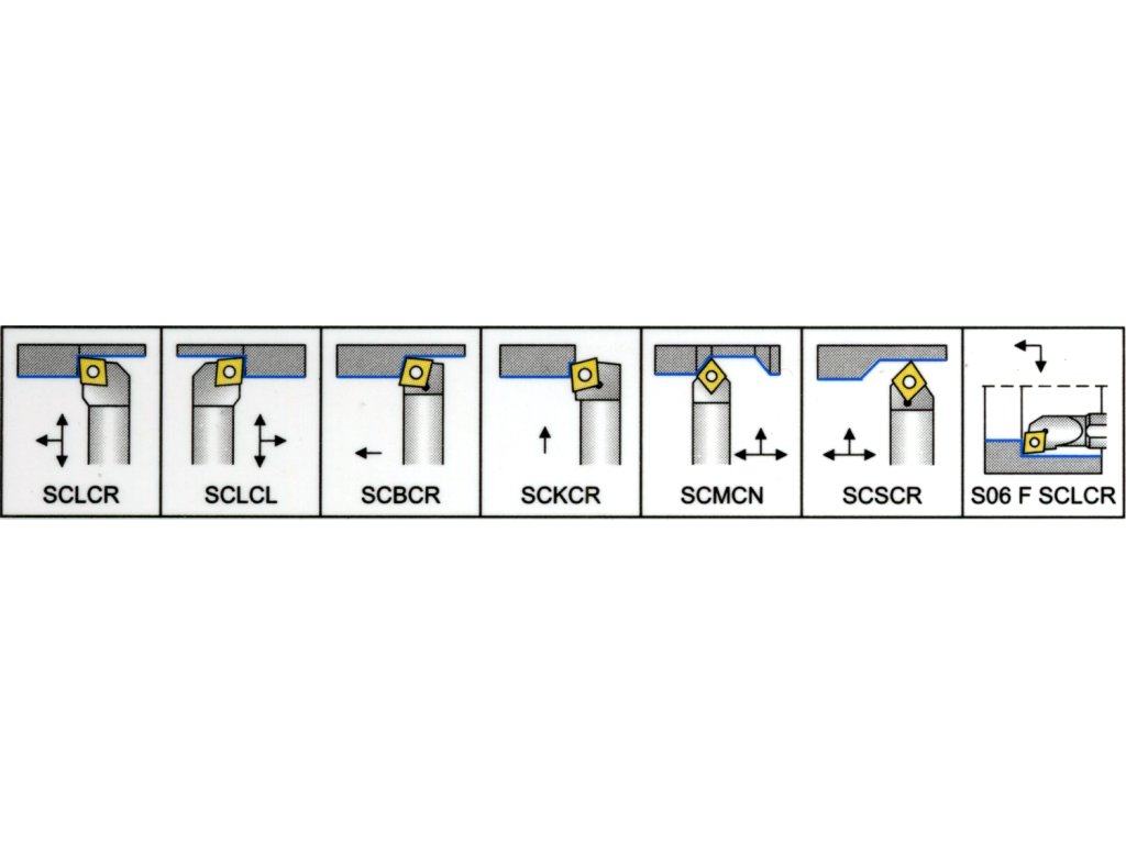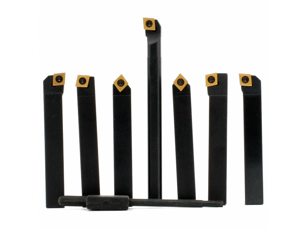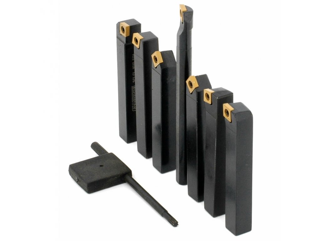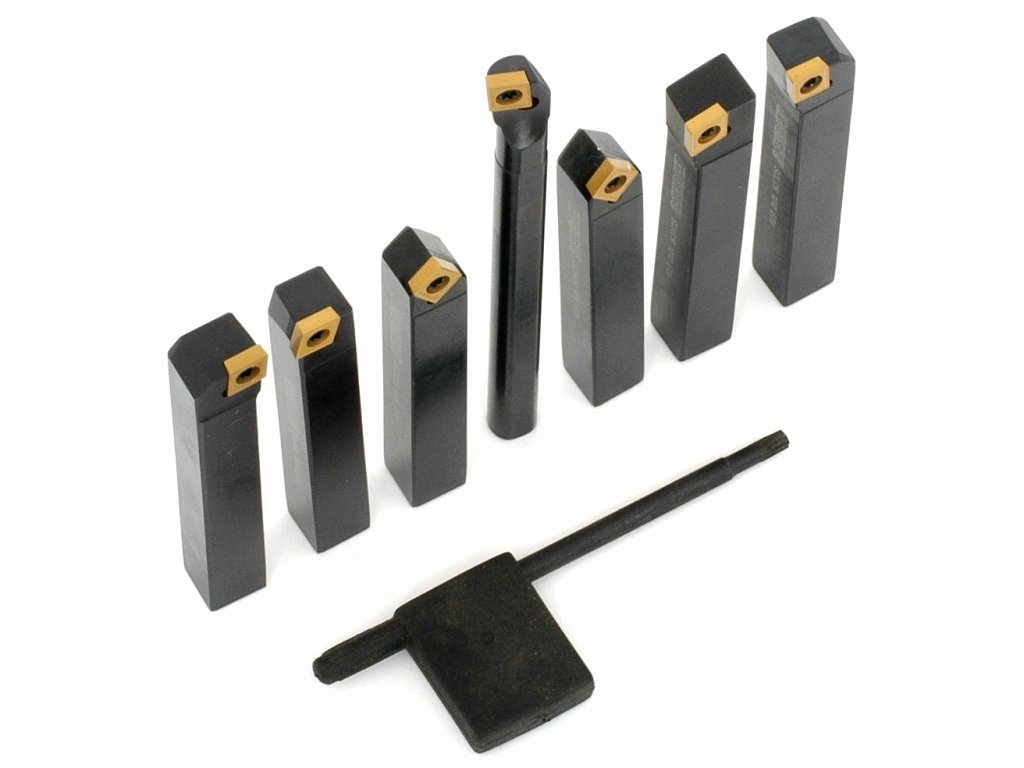Sada kvalitních soustružnických nožů (uchycení 10 × 10 mm) s břitovými destičkami obsahuje 6 ks ubíracích nožů, čelních i stranových, levých i pravých a 1 ks vyvrtávací nůž ø 10 mm pro širokou škálu použití. Náhradní břitové destičky obj. č. 700101.