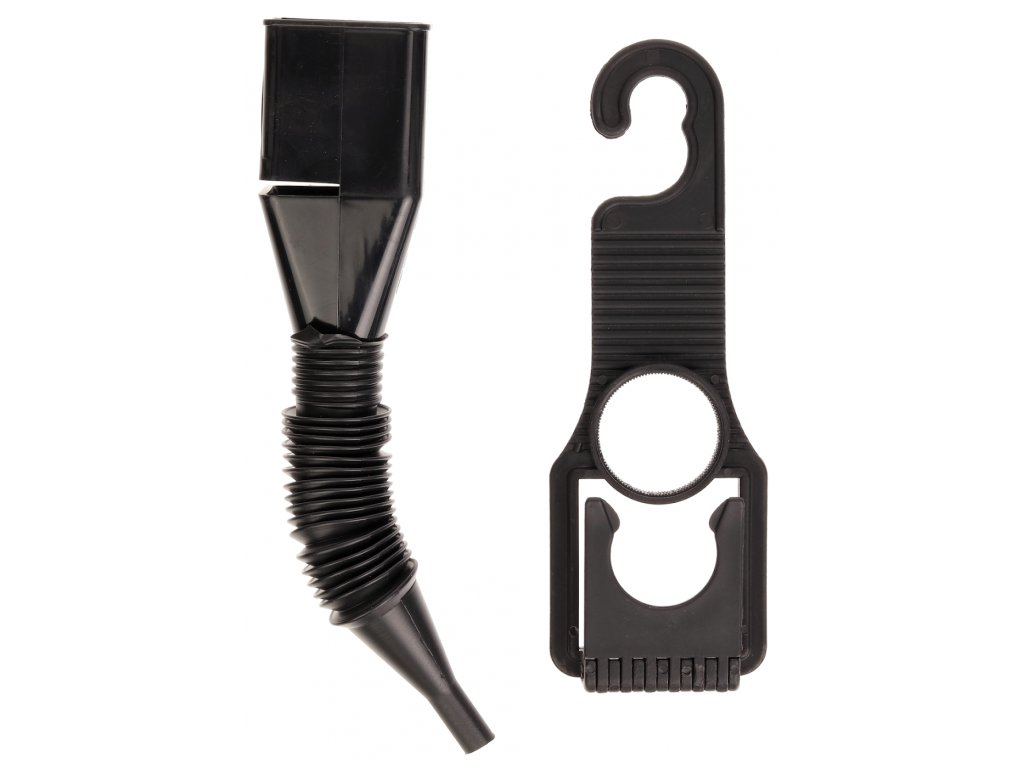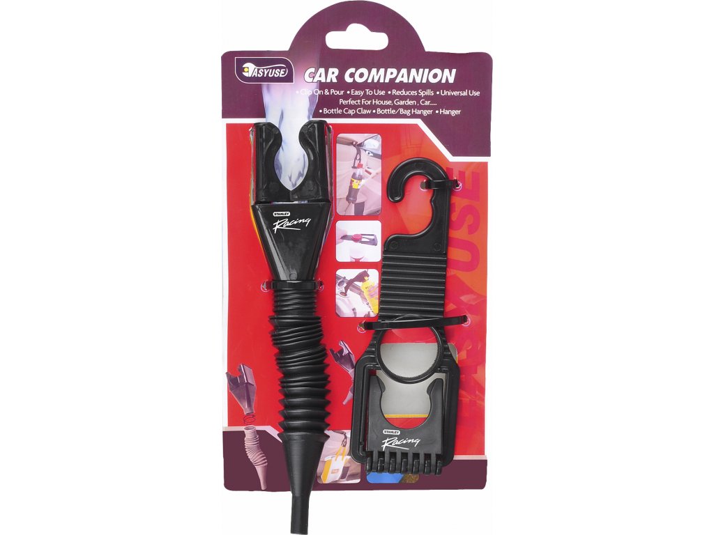 Obsahuje nálevku kapalin s ohebným krkem, která zabrání nechtěnému odkapávání z hrdla nádoby a víceúčelový hák s výklopným úchytem, držákem lahví a uvolňovačem plastových víček. Vyrobeno z plastu PP. Dodáváno upevněné na kartonové podložce.