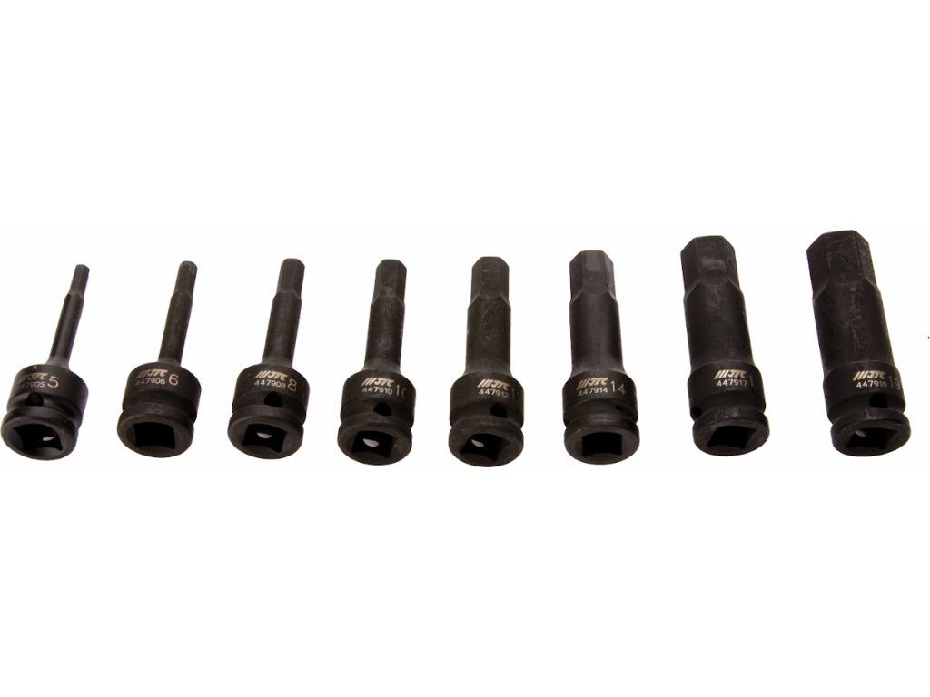 Sada prodloužených nástrčných klíčů – vnitřní inbus 5, 6, 8, 10, 12, 14, 17, 19 mm. Určeno pro 1/2“ golu nebo utahovák, černěno. Baleno v plastovém boxu.
