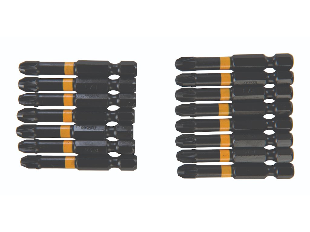 Sada bitů z oceli S2 určených pro vyšší kroutící momenty a dlouhou životnost. Vhodné i pro rázové šroubováky.