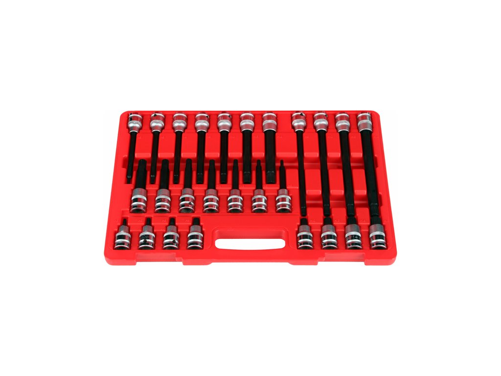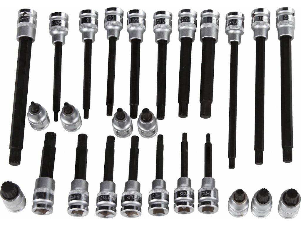 Obsahuje celkem 26 ks bitů typu SPLINE z kvalitní ocele S2 pro 1/2" ráčnu v délkách 55 mm (M5, M6, M8, M9, M10, M12, M14 a M16), 100 mm (M5, M6, M8, M9, M10, M12 a M14), 140 mm (M5, M6, M8, M9, M10, M12 a M14) a 200 mm (M8, M10, M12 a M14). Uloženo přehledně v plastové kazetě.