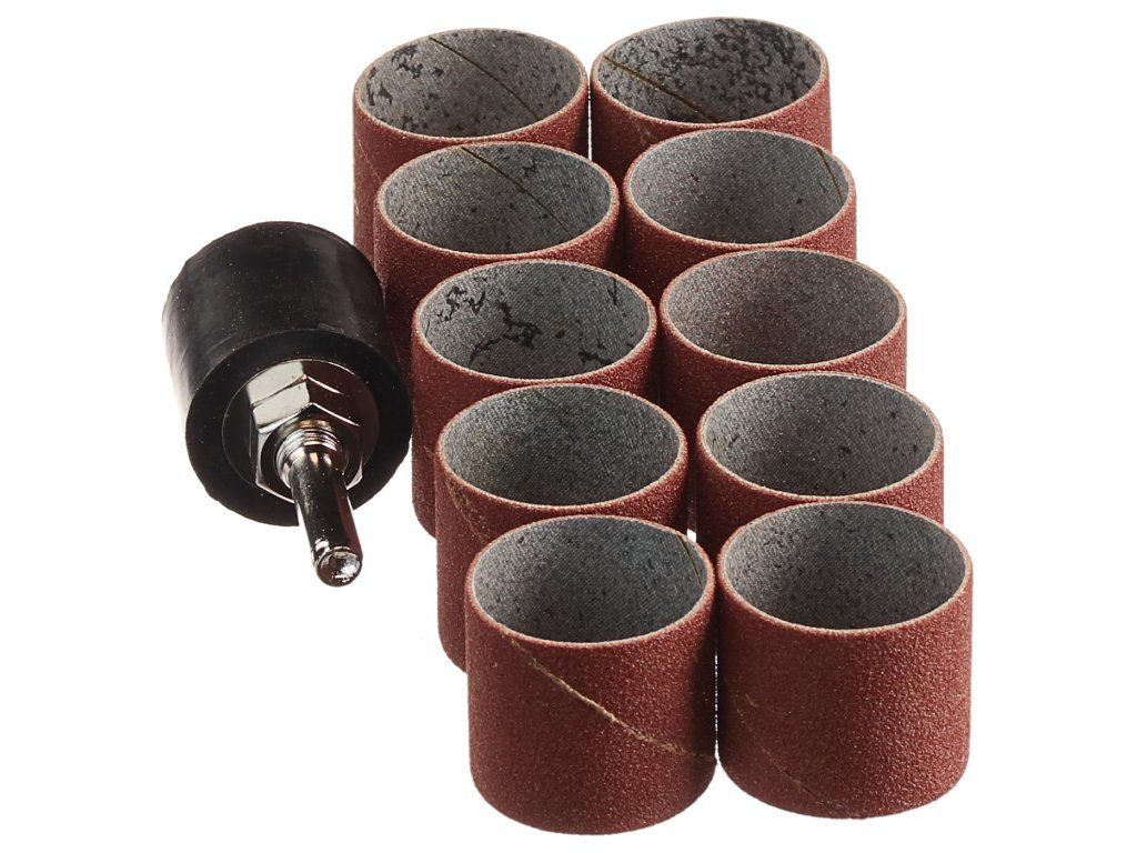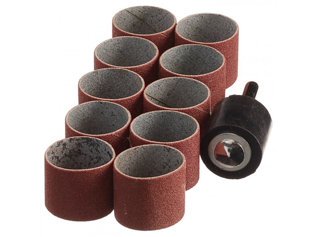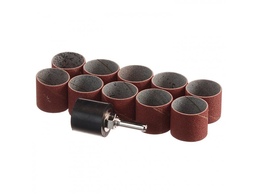 Sada obsahuje 10 kusů brusných objímek o průměru 25 mm a gumový unašeč na stopce. Zejména vhodné pro tvarové broušení dřeva. Průměr stopky 6 mm; otáčky max. 3000/min; celková výška = 57 mm; výška brusných dutinek = 23 mm. Hrubost P80.