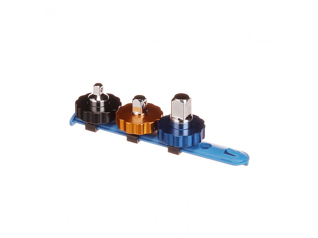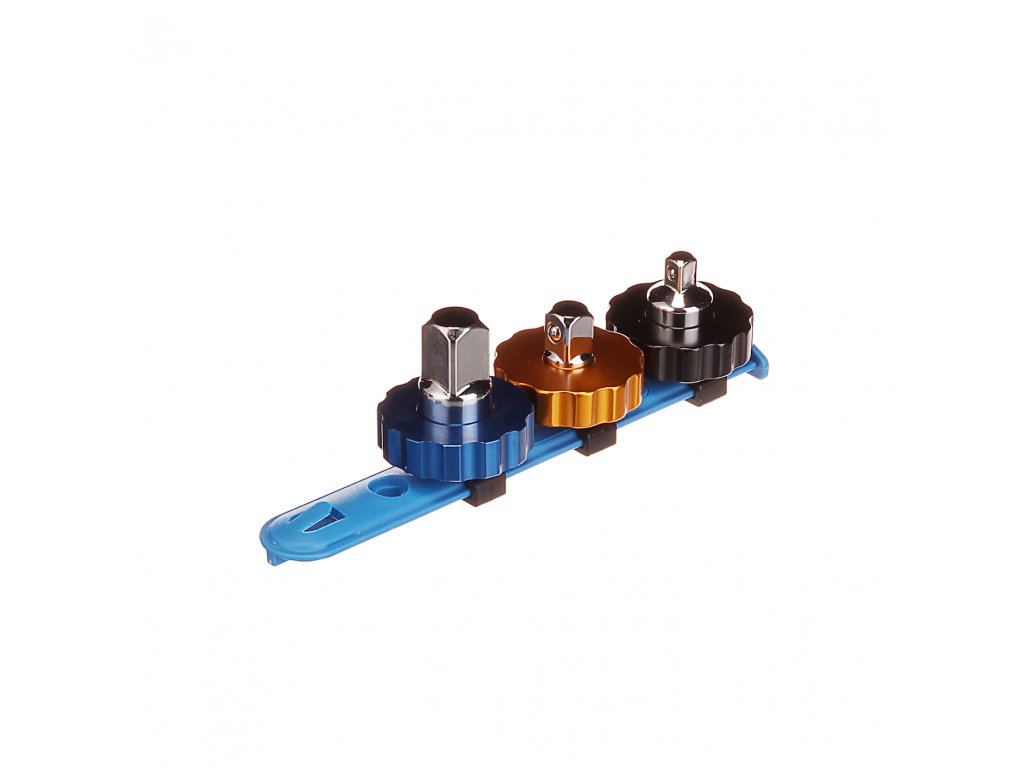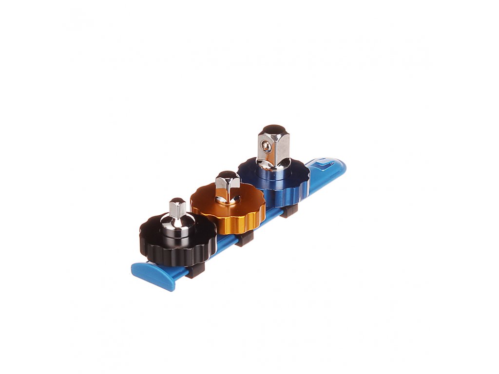 Sada pro práci v hůře dostupných místech obsahuje: 3/8" vnitřní na 1/2" vnější; 1/4" vnitřní na 3/8" vnější a 3/8" vnitřní na 1/4" vnější. Adaptéry jsou pro lepší přehlednost barevně odlišeny. V praktickém plastovém držáku.