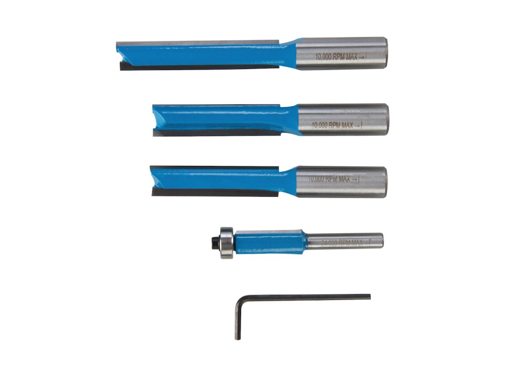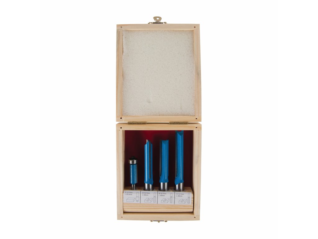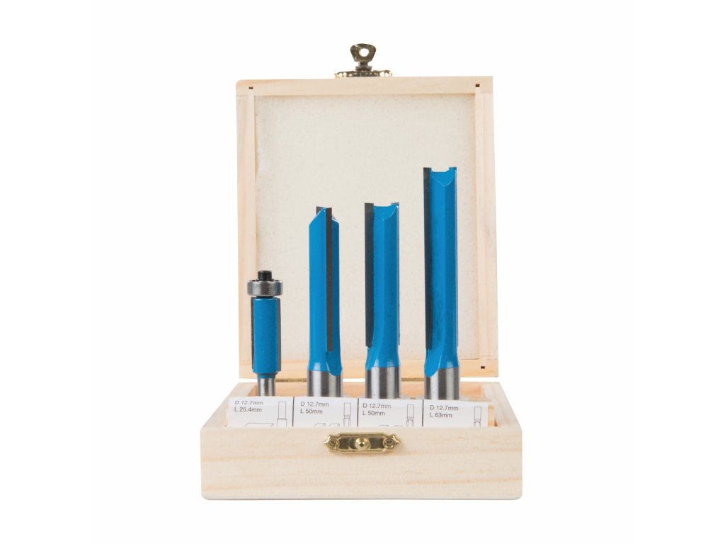 Komplexní sada fréz pro montéry kuchyní. Břity z karbid-wolframové oceli TCT a silné, kalené ocelové stopky. Dodáváno v dřevěném úložném kufříku. Obsahuje: 1 × přímou ořezávací frézu 63 × 12,7 mm se stopkou 12 mm; 2 × přímé ořezávací frézy 50 × 12,7 mm se stopkou 12 mm a 1 × zarovnávací frézu 25,4 × 12,7 mm se stopkou 8 mm a ložiskem.