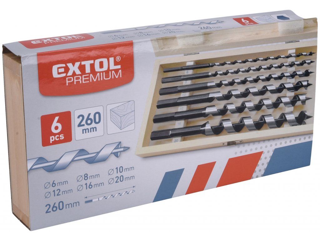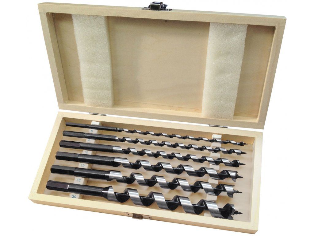 Sada 6 ks hadovitých vrtáků pro vrtání přesných děr v neštípavém dřevě, celková délka 260 mm. Stopka je válcová částečně vnějším šestihranem. Průměr: 6 – 8 – 10 – 12 – 16 – 20 mm, dodáváno v dřevěném pouzdře.
