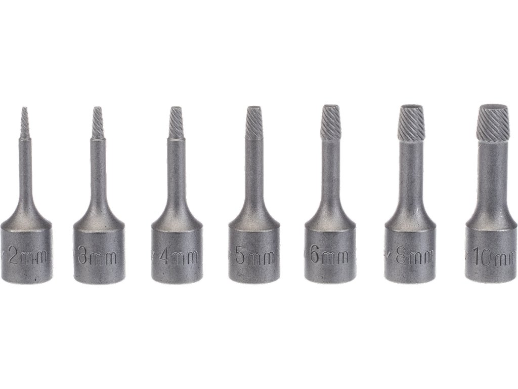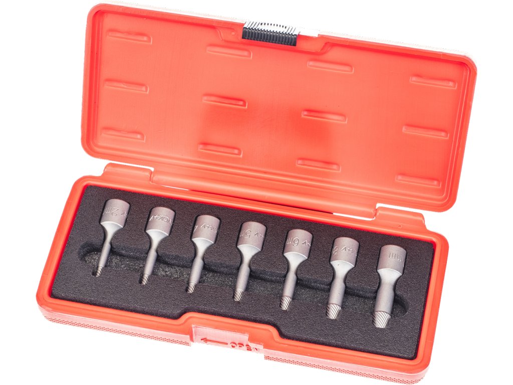 Sada bitů pro povolení poškozených šroubů s INBUS hlavou 2, 3, 4, 5, 6, 8 a 10 mm. Kuželový profil s levotočivým drážkováním umožňuje povolit šrouby se strženým vnitřním šestihranem. Určeno pro golu 3/8", vyrobeno z CrMo oceli. Baleno přehledně v plastovém pouzdře.