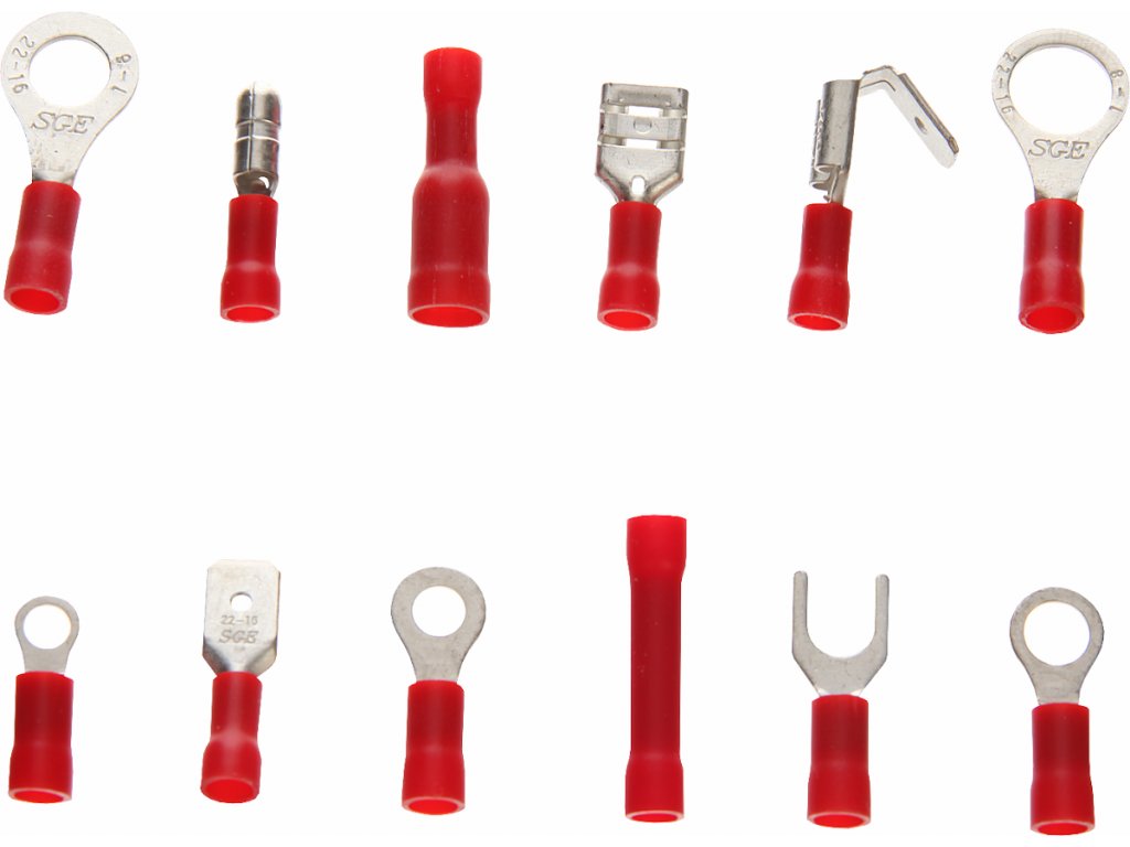 Sada 275 ks spojovacích dílů s červenou izolací pro opravy kabelů v automobilu. Obsahuje kabelová oka 6, 4, 2, 1/4", 5/16", konektory, vidlice a spojky kabelů. Uloženo přehledně v plastové kazetě.