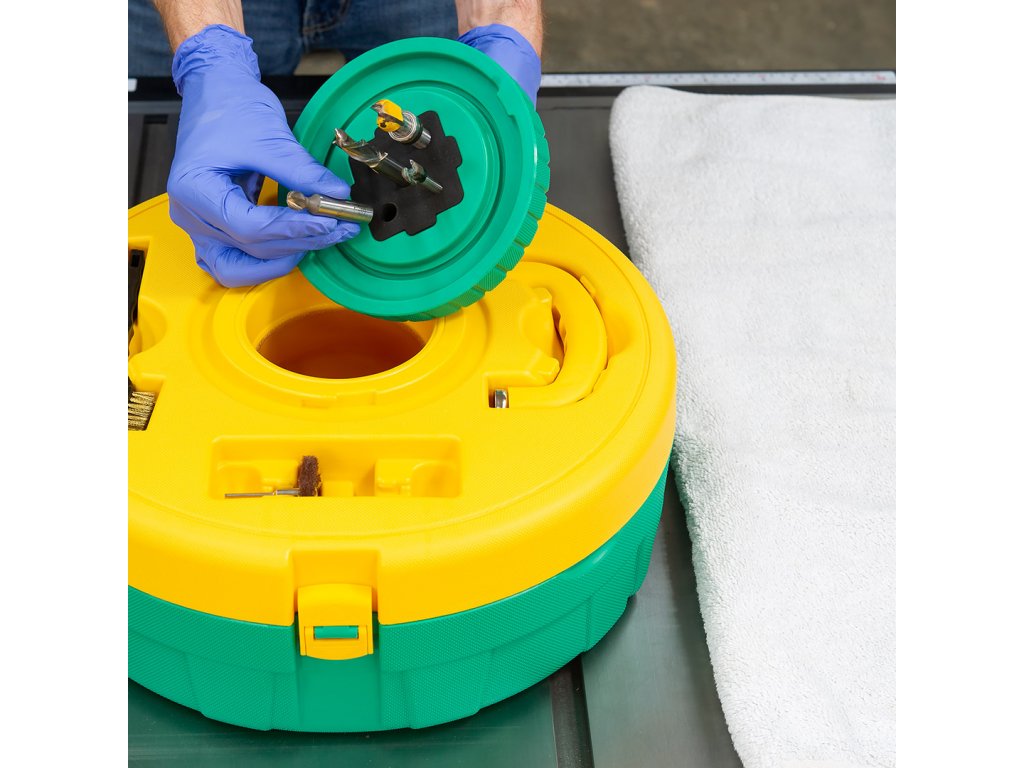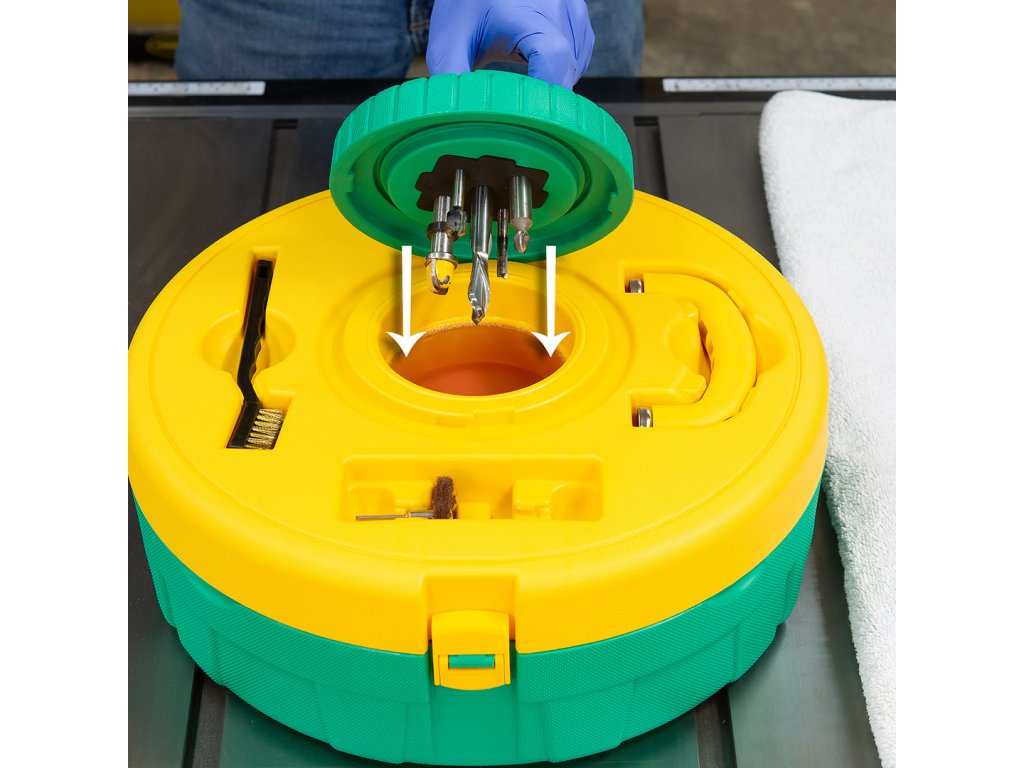 Držák frézovacích bitů umožňuje v rekordním čase namočit a vyčistit až pět bitů pomocí přiložených čisticích kotoučů. Kompatibilní s: velikostmi bitů 1/4", 1/2", 6 mm, 8 mm a 12 mm.
