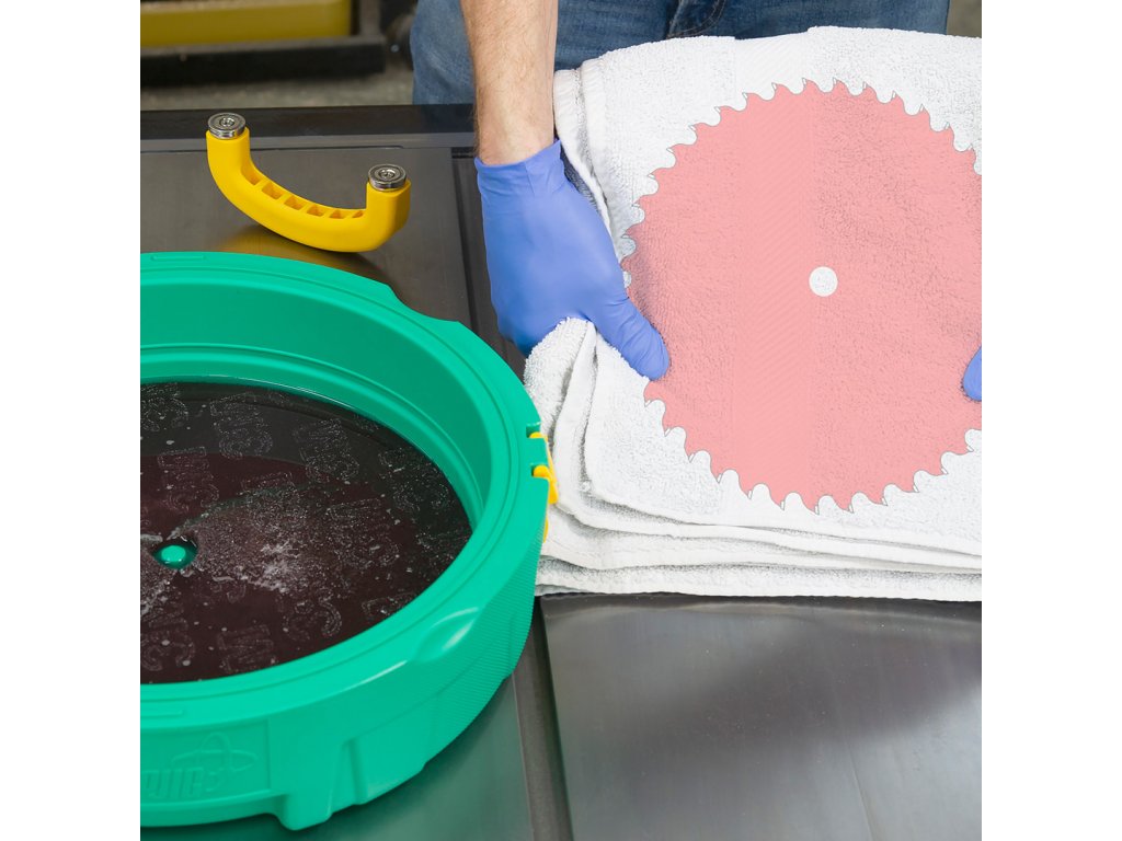 Magnetická rukojeť se připevní k pilovému kotouči, takže vaše pokožka nepřijde do styku s drsnými chemikáliemi nebo ostrými řeznými hranami.