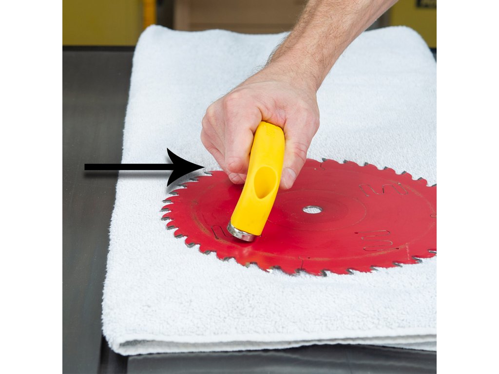 Už žádné drátěné kartáče! Čistící podložka je jedinečně uzpůsobena k tomu, aby se dostala do každého zákoutí pilového kotouče. Vyčistěte celou stranu pilového kotouče jediným pohybem.