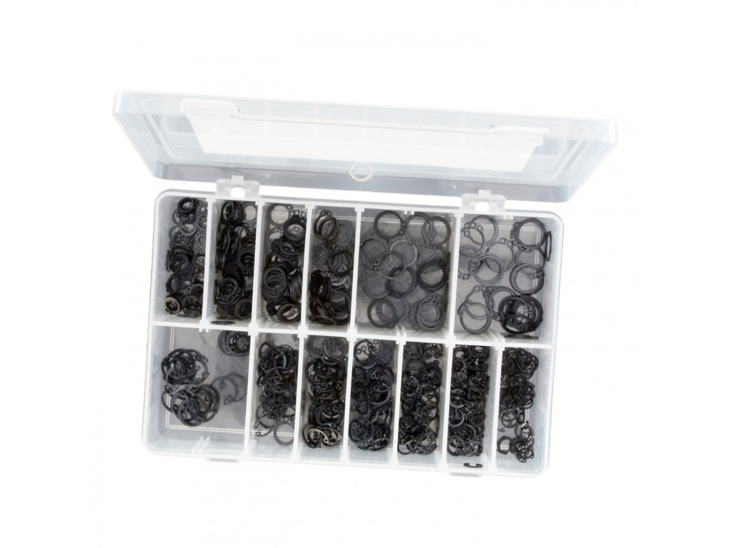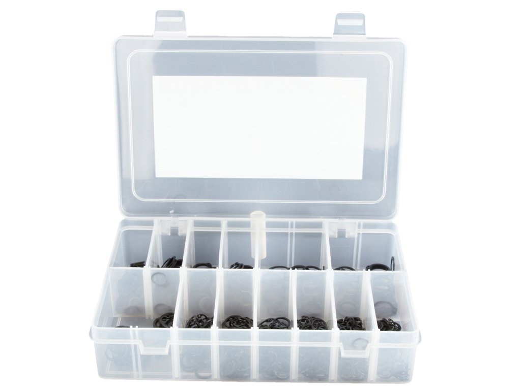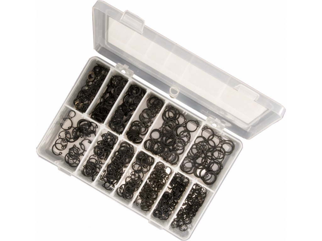 Sada obsahuje vnitřní a vnější pojistné kroužky pro díry DIN 472 a hřídele DIN 471. Baleno v plastovém organizéru s víkem, 625 ks, průměry pro díry 9, 10, 11, 12, 13, 14, 15 mm; průměry pro hřídele 8, 10, 11, 12, 14, 15 mm.