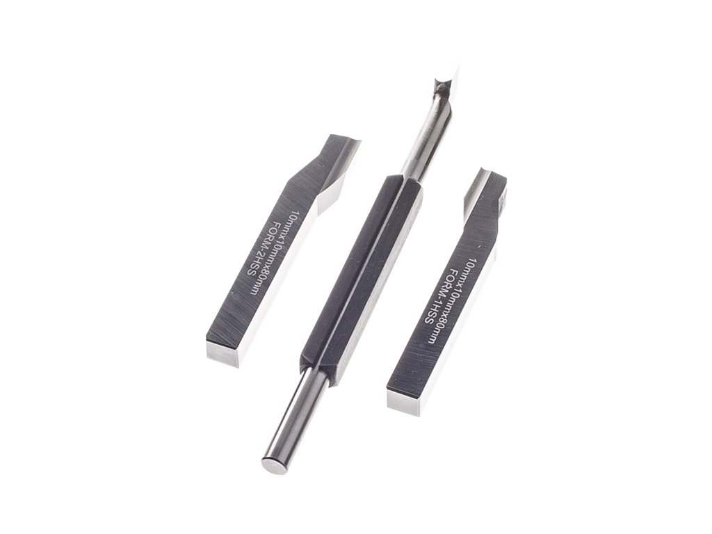 Obsahuje nože pro obrábění kovů, levý a pravý stranový uběrák 10 × 10 × 80 mm, vnitřní uběrák s držákovým pouzdrem 8 × 140 mm, materiál nástrojová ocel HSS.