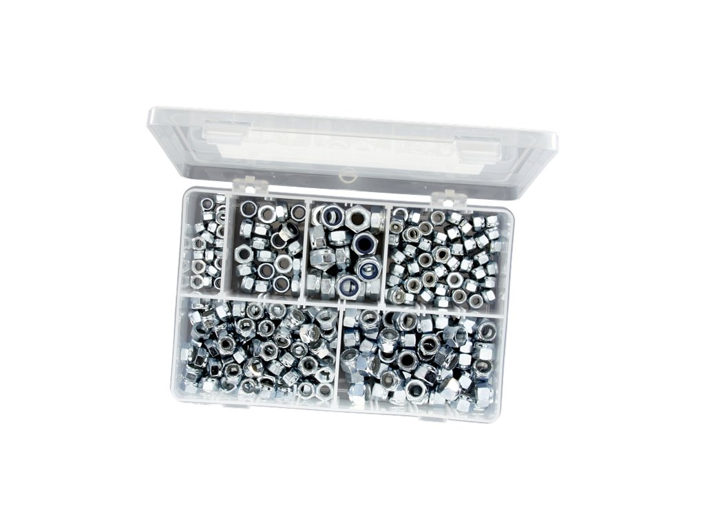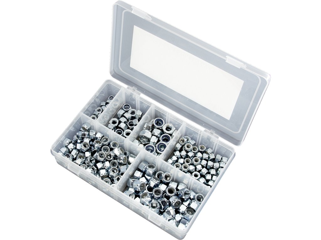 Sada 260 ks ocelových samojistných matic s nylonovou vložkou v plastovém organizéru s víkem. Balení obsahuje velikosti M6, M8, M10, 1/4“UNF, 5/16“UNF, 3/8“UNF.