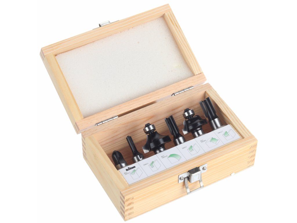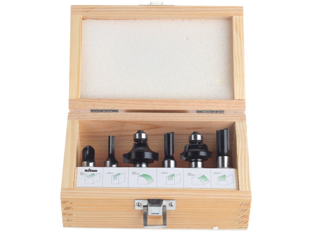 Frézy s wolfram karbidovým ostřím, s vysoce odolným tělem, se stopkou o průměru 1/2” (12,7 mm). Dvojbřité frézy pro čisté a přesné frézování. Vhodné pro měkké a tvrdé dřevo, dřevotřísky, MDF desky a překližky. Balení zahrnuje žlábkovou frézu, zaoblovací frézu vydutou, profilovou čelní frézu a 3 ks drážkovacích fréz ø 6,3; 9,5; 12,7 mm