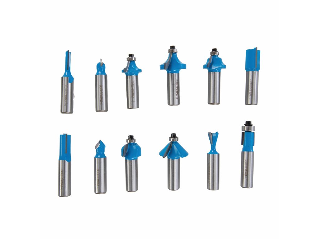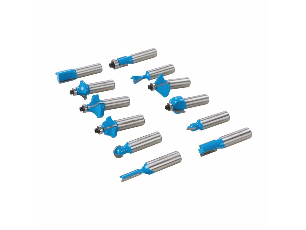 Ostré TCT břity, silná, kalená ocelová stopka 12 mm. Obsah sady: ořezávací fréza 6 × 20 mm, 12 × 20 mm, 16 × 20 mm; fréza na V drážku 90° 12,7 mm; rybinová fréza 12,7 mm; 45° úhlová fréza 32 mm; drážkovací fréza s ložiskem 12,7 × 13 mm; zaoblovací fréza vydutá R 6,3 mm D 22,2mm, R 9,5 mm D 28,6 mm; žlábková fréza R 6,3 mm D 12,7 mm; zaoblovací fréza vypouklá R 6,3 mm D 22,2 mm; profilová čelní fréza R 4 mm D 25,5 mm.