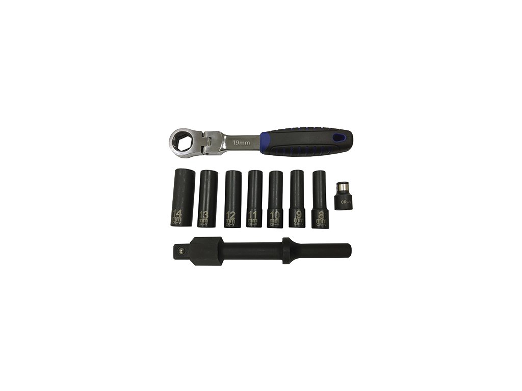 Sada usnadňuje povolení zarezavělých matic, šroubů a zabraňuje jejich utržení. Vhodné použití pro výfukové systémy, zapalovací svíčky, injektory, brzdy, apod. Tato sada nástrojů vyžaduje použití pneumatického rázového kladiva. Obsahuje rázovou hřídel 3/8", adaptér 3/8", kloubovou oboustrannou ráčnu 72 zubů, nástrčné CR-V klíče 8, 9, 10, 11, 12, 13 a 14 mm. Baleno v plastovém kufru.