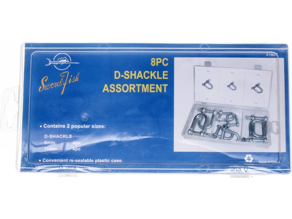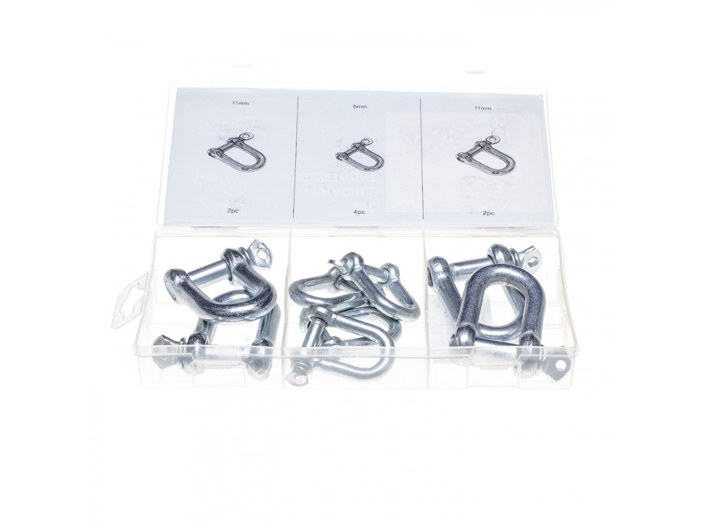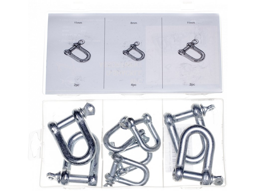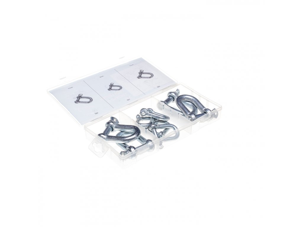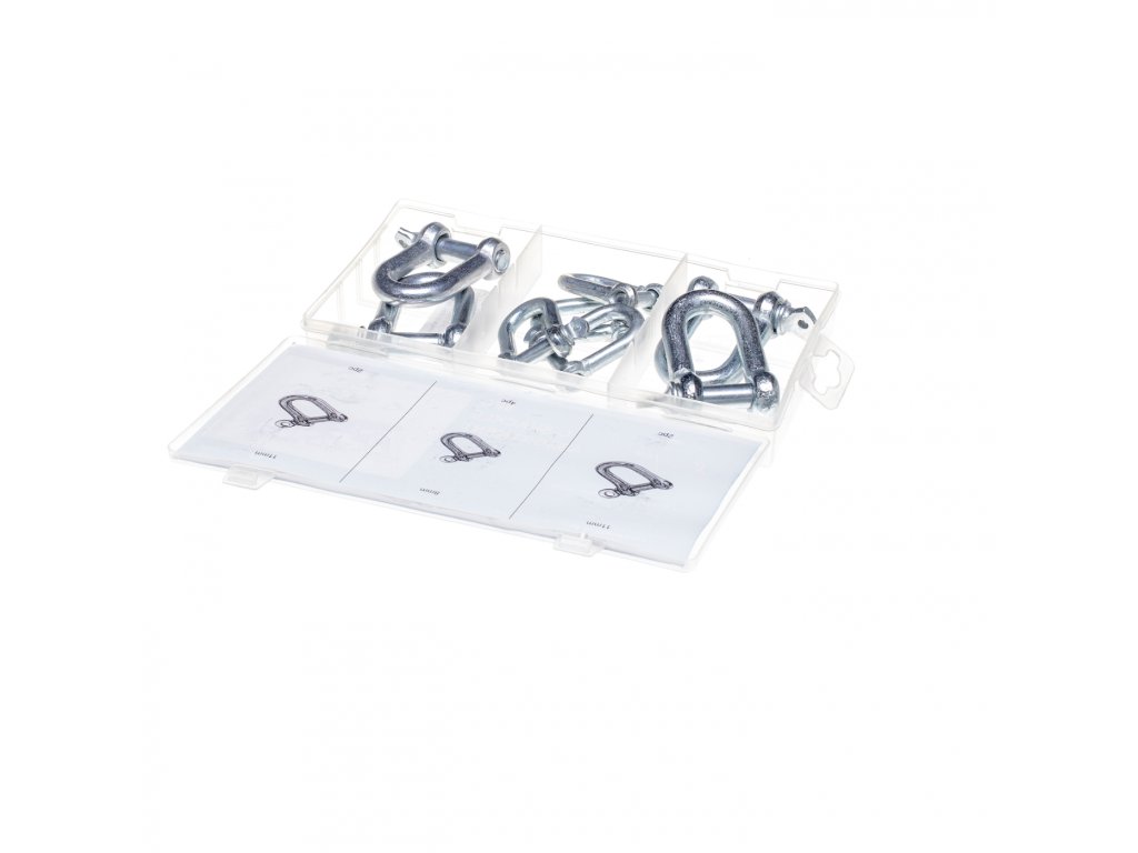 Slouží k všeobecným účelům, spojení lano – hák. Nelze kompletovat přímo do řetězu. Tělo/čep ø7mm/světlost 16 mm/4 ks a ø11mm/světlost 20 mm/4 ks. Třmen je zajištěn šroubem. Materiál uhlíková ocel, pozinkováno, dodáváno v plastové kazetě.