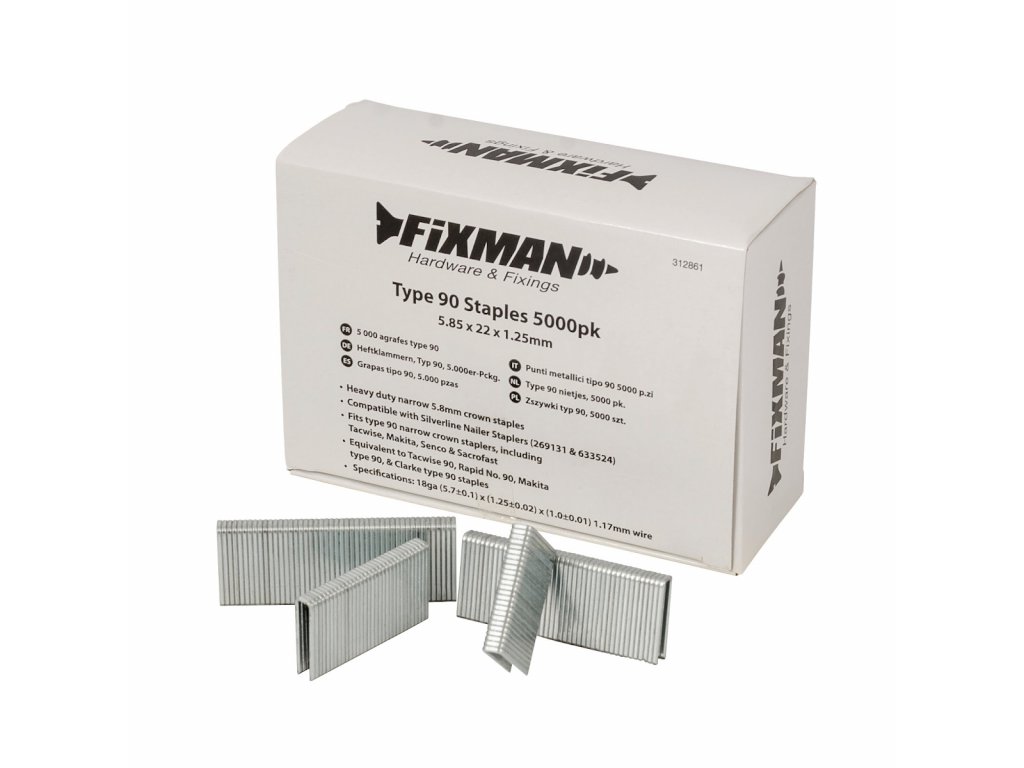 Úzké, silné sponky, vhodné pro sponkovačky Silverline (269131 a 633524) a pro další úzké sponkovačky typu 90, např. Tacwise, Makita, Clarke, Senco a Sacrofast. Specifikace: 18ga (5,7 ± 0,1) x (1,25 ± 0,02) x (1,0 ± 0,01) 1,17 mm.