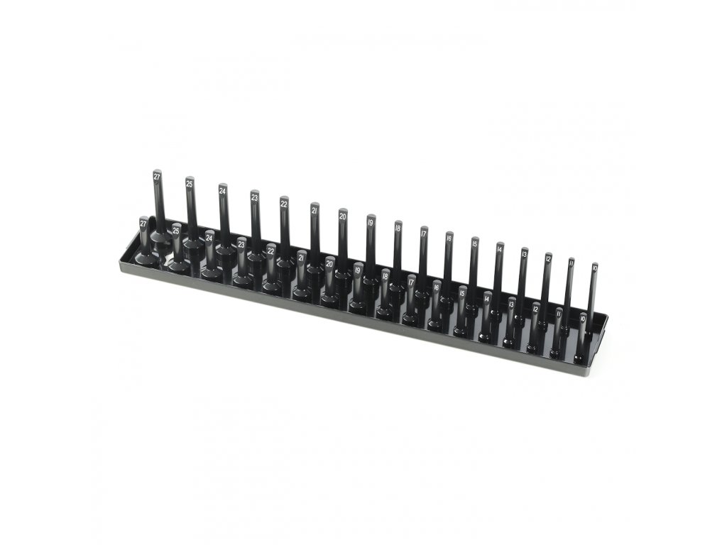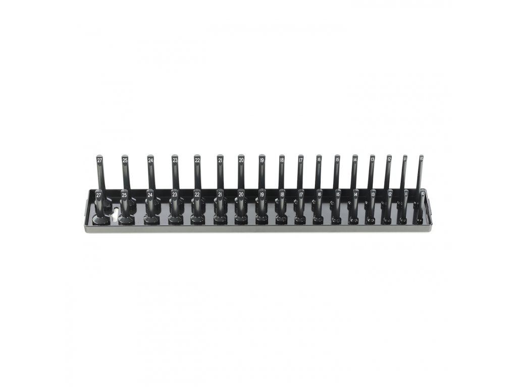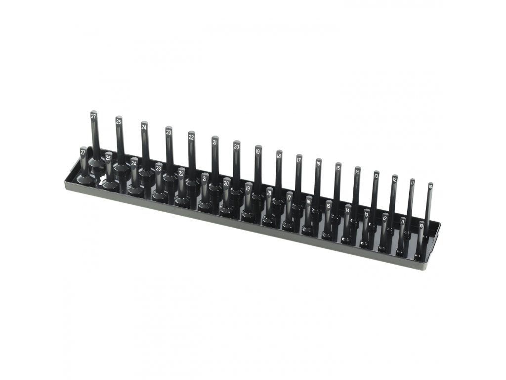 Vhodný pro přehledné uložení dlouhých a krátkých klíčů rozměrů 10, 11, 12, 13, 14, 15, 16, 17, 18, 19, 20, 21, 22, 23, 24, 25, 26, 27 mm k 1/2" ráčně. Rozměry 520 × 88 × 95 mm, materiál ABS.