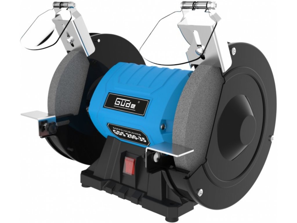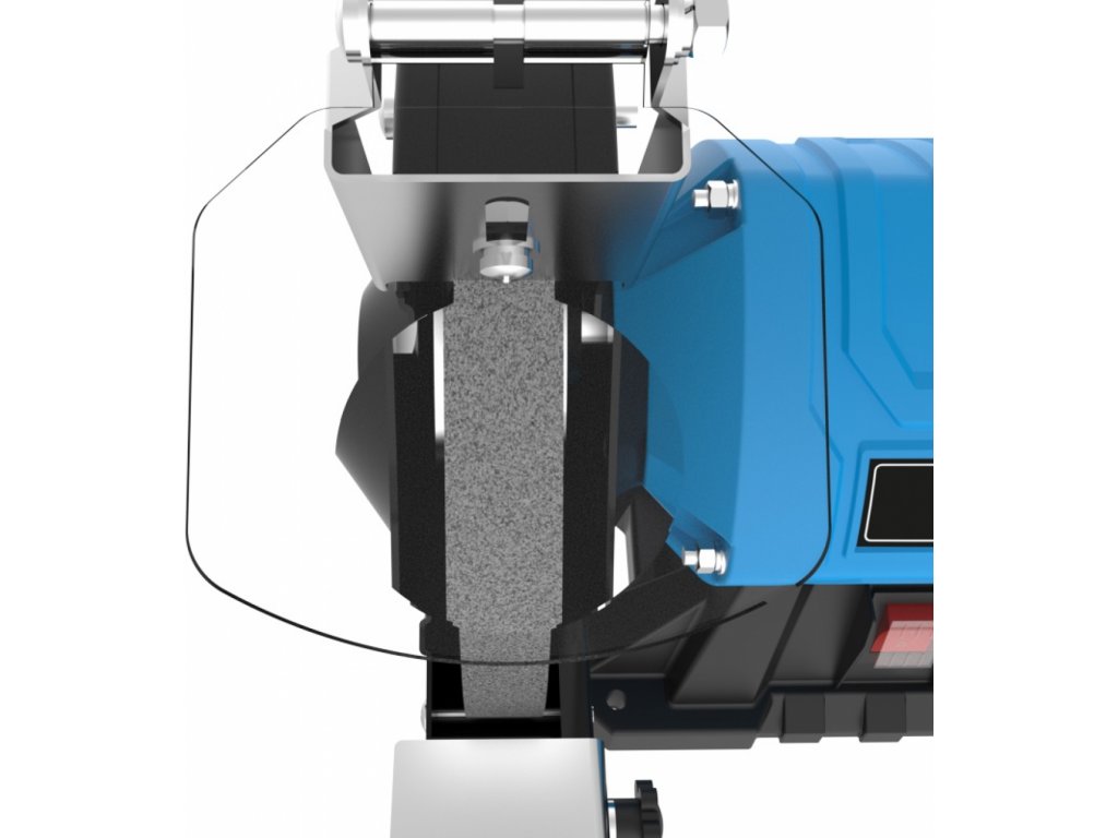 Konstrukce: vylehčená kovová skříň, nastavitelné opěrky obrobku, ochranné kryty proti jiskrám, robustní podstavec (vč. otvorů pro montáž na pracovní desku).
