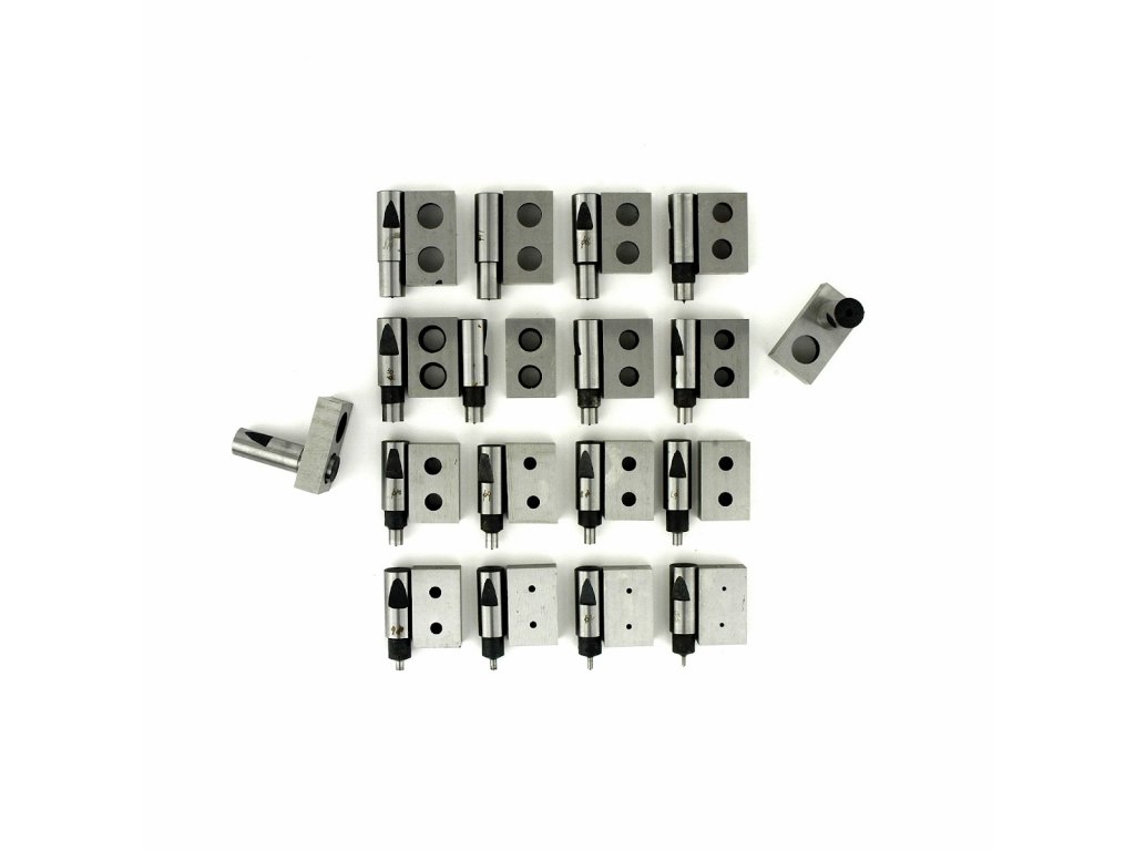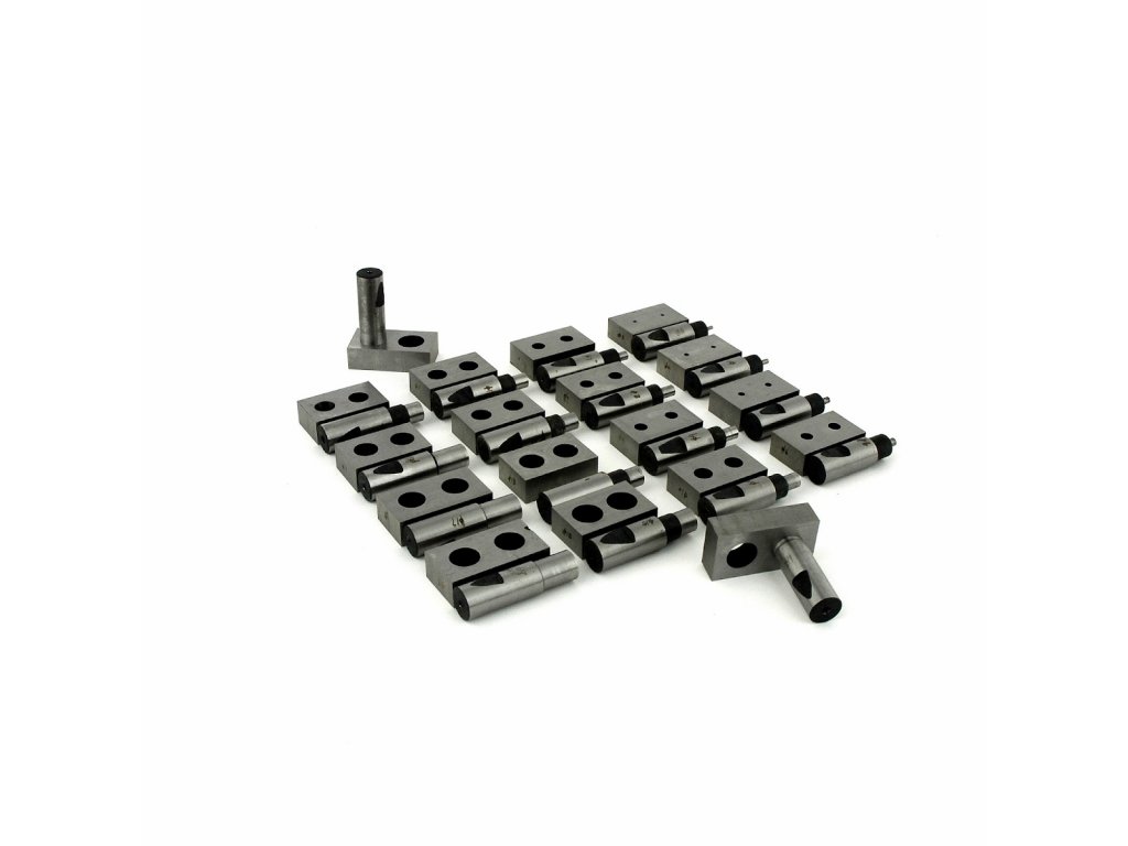 Sada 18 ks střižníků a střižnic pro prostřihovačku HP-10 a HP-20, průměry 3, 4, 5 … až 20 mm (po 1 mm).