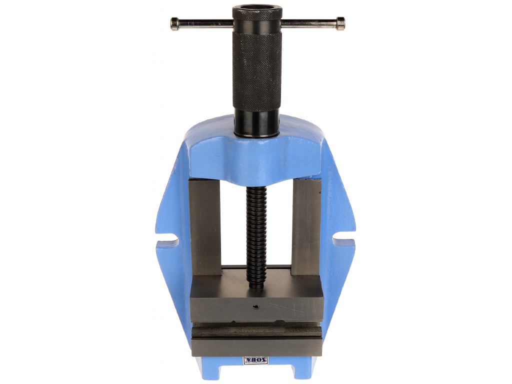 Masivní, strojní svěrák. Čelisti jsou opatřeny horizontální a vertikální prizmatickou drážkou pro uchycení kulatých obrobků.