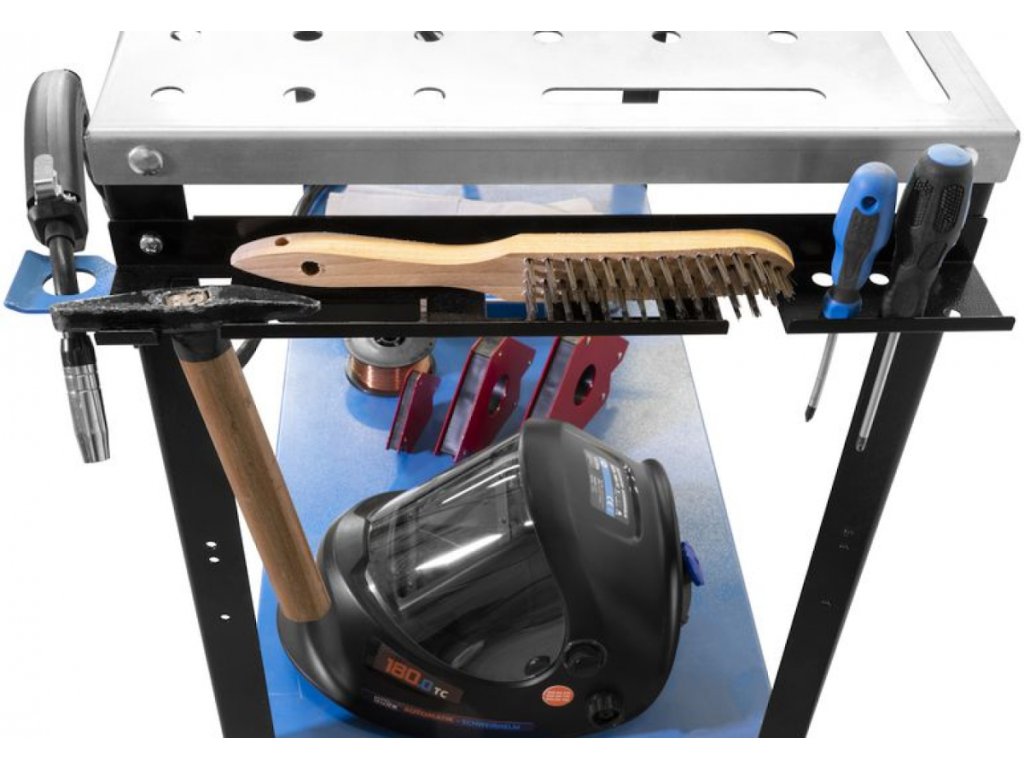 Deska stolu s otvory k zajištění svařence pomocí přípravků; konzola na svařovací zdroj; odkládací police (2).
